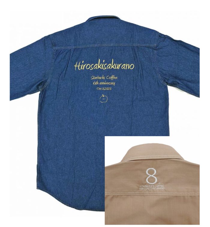 青森県弘前市にあるスターバックス弘前さくら野店様のオリジナルデニムシャツを製作させていただきました。ご注文くださり本当にありがとうございます。さらに完成写真のホームページ掲載についてもご確認くださり感謝しております。