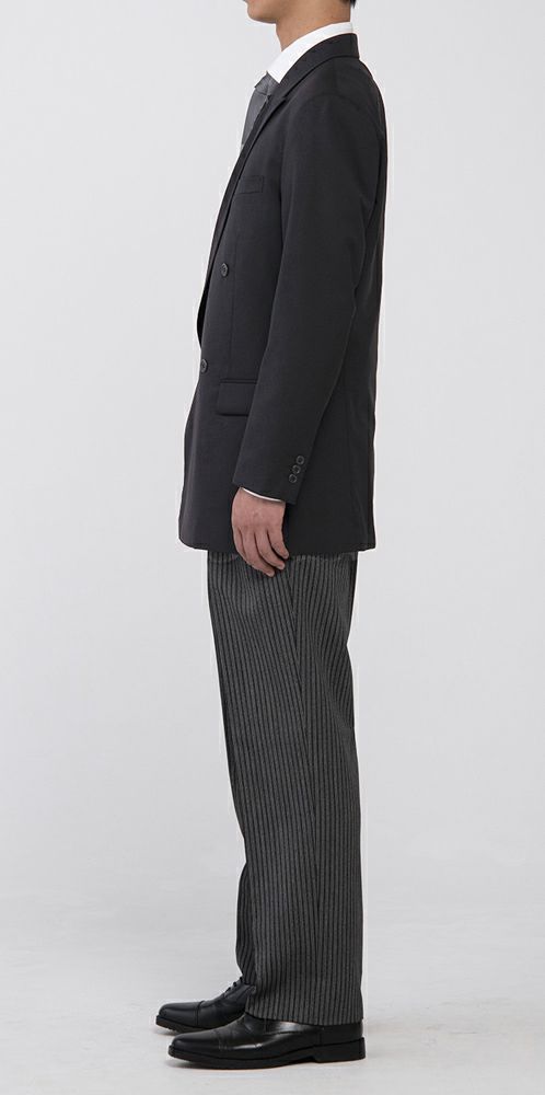 縞コールパンツ、昼間の礼装として着用するパンツです。ホテル・レストランではマネージャークラスより上、ホテルによっては総支配人が着用されているのをお見かけします。ジャケットはタキシードやダブルスーツなどに合わせるのがオススメです。ポリエステル高混率のユニフォーム素材ですので、見た目の高級感を保ちながら耐久性が豊かになっています。前カン留め、膝裏付き。ツータックのゆったりしたシルエットです。 |