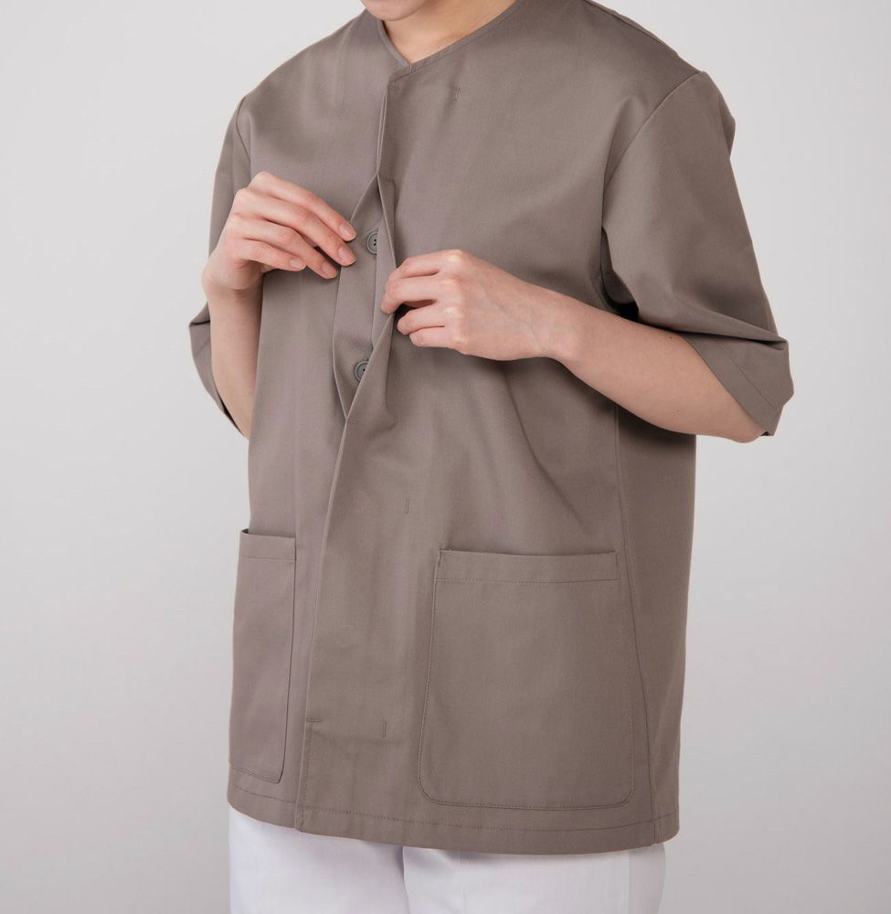 和の上衣(U-WA-GI)として作成。作務衣や白衣とは違う新しいカテゴリーです。和のコートバリエーションはとても少なく、且つ昨今和食の世界も色々な文化が混じり合い益々進化していく中、表現の出来る和の上衣がありませんでした。デザインの最たるポイントは衿。白衣のようなデザインに見えますが襟ぐりのコンパクトなラインとミニマム、シンプルであることが潔い和の世界観を感じさせます。もう一つのポイントは胸元に広い範囲で刺繍を入れることが出来るところ。とても映えます。生地はポリエステルと綿の混紡糸で作られ、耐久性に富んでいながら綿風合いが豊かなツイル生地。上品な綾目が特徴です。撥水撥油機能あり。この上衣に合わせるエプロンも同素材同色で開発しています。4色展開。色に関しても同じく新しい和の世界にあう内装テクスチャーの色をイメージし、そこに調和するような色展開です。 |
