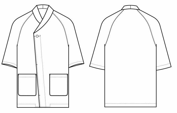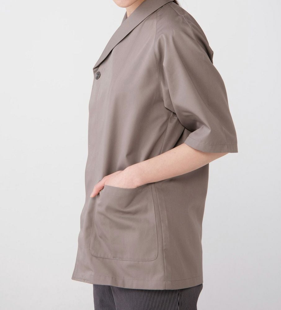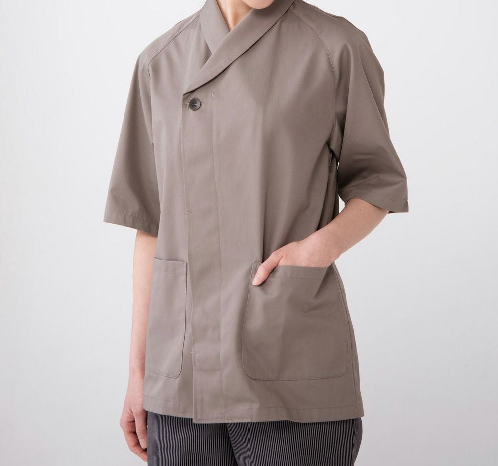 和の上衣(U-WA-GI)として作成。作務衣や白衣とは違う新しいカテゴリーです。和のコートバリエーションはとても少なく、且つ昨今和食の世界も色々な文化が混じり合い益々進化していく中、表現の出来る和の上衣がありませんでした。デザインの最たるポイントは短いへちま衿。胸元から内側が見えない合わせ、そして胸に刺繍もしっかり入れることが出来るところに注力しました。ミニマム、シンプルであるアイテムです。生地はポリエステルと綿の混紡糸で作られ、耐久性に富んでいながら綿風合いが豊かなツイル生地。上品な綾目が特徴です。撥水撥油機能あり。この上衣に合わせるエプロンも同素材同色で開発しています。4色展開。色に関しても同じく新しい和の世界にあう内装テクスチャーの色をイメージし、そこに調和するような色展開です。 |