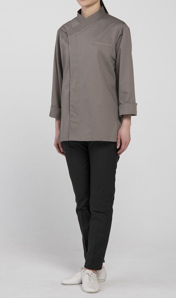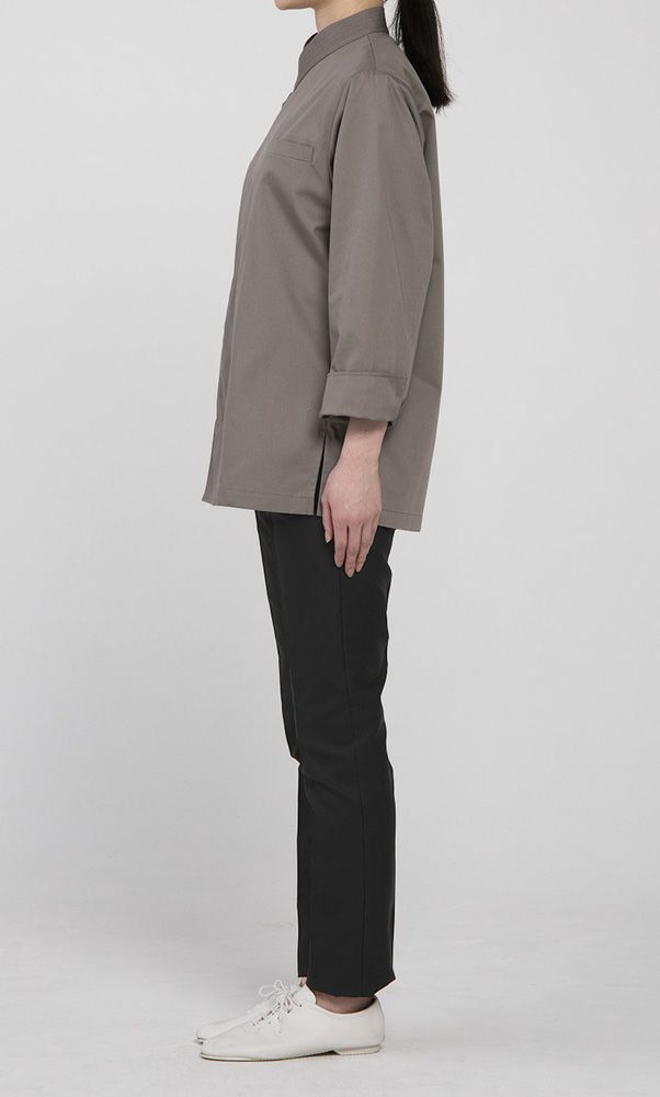 和の上衣(U-WA-GI)として作成。作務衣や白衣とは違う新しいカテゴリーです。和のコートバリエーションはとても少なく、且つ昨今和食の世界も色々な文化が混じり合い益々進化していく中、表現の出来る和の上衣がありませんでした。デザインの最たるポイントは衿。ステッチを施し和から洋まで着用出来ます。ミニマム、シンプルであることに注力したアイテムです。生地はポリエステルと綿の混紡糸で作られ、耐久性に富んでいながら綿風合いが豊かなツイル生地。上品な綾目が特徴です。撥水撥油機能あり。この上衣に合わせるエプロンも同素材同色で開発しています。4色展開。色に関しても同じく新しい和の世界にあう内装テクスチャーの色をイメージし、そこに調和するような色展開です。 |