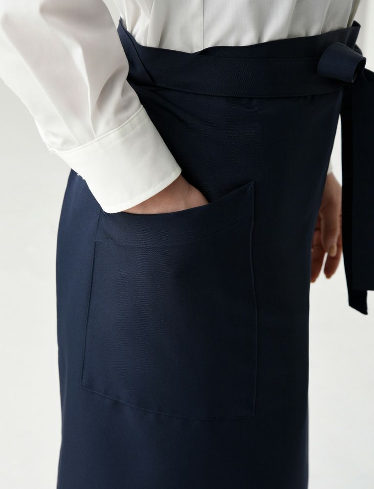 ベーシックな制電素材の腰下ロング丈エプロンは、和・洋・中、店舗を選ばず、幅広くお使いいただけます。