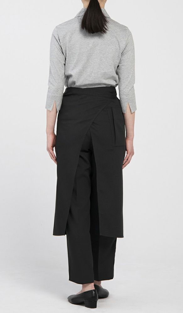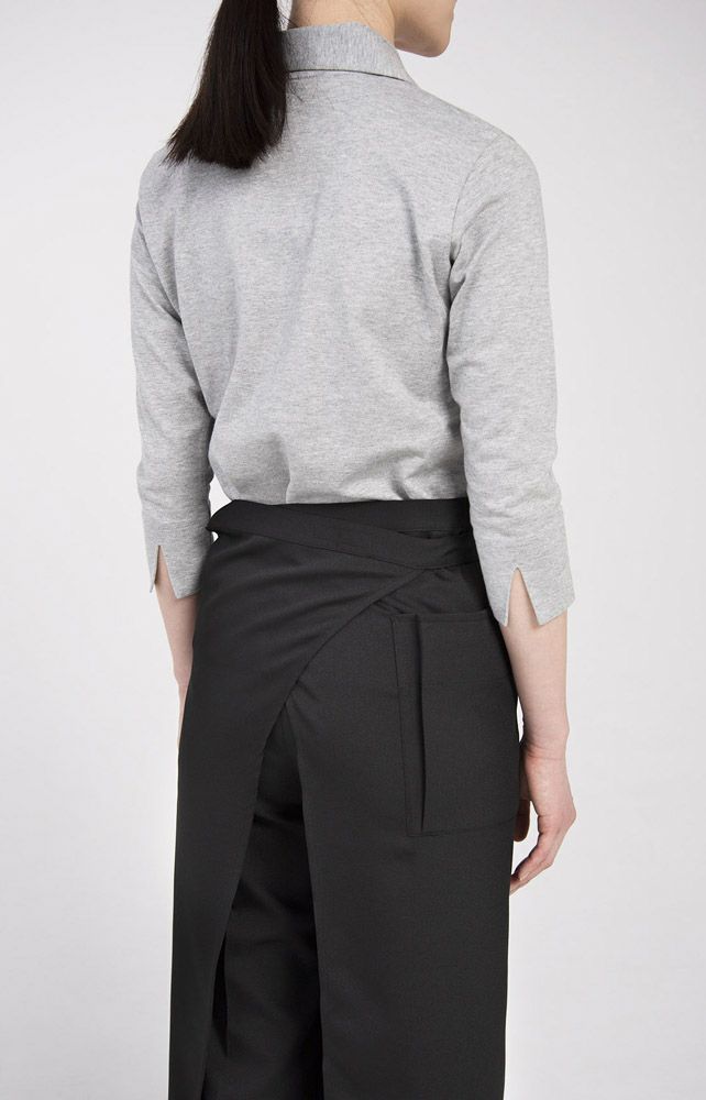 黒原着糸を使用した生地ですので塩素や日光、経年での色落ちはほぼしません。永くきれいな黒のまま使用出来ます。生地の表情、ドレープも豊かですのでシンプルなエプロンですが着用時の高級感はとても高いものになっています。ストレッチが素晴らしくソムリエタイプにはとても効果的、動き易いです。高級レストランサービスにぴったりです。エコに関して、黒原着糸を作る際に水をほとんど使用しません。また色含めポリエステル100%ですので耐久性も高く、永く着用することもエコにつながると考えています。 |