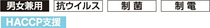 機能 左胸ポケット、ファスナー開閉式、体毛落下防止ネット、男女兼用、抗ウイルス、制菌、制電、HACCP支援