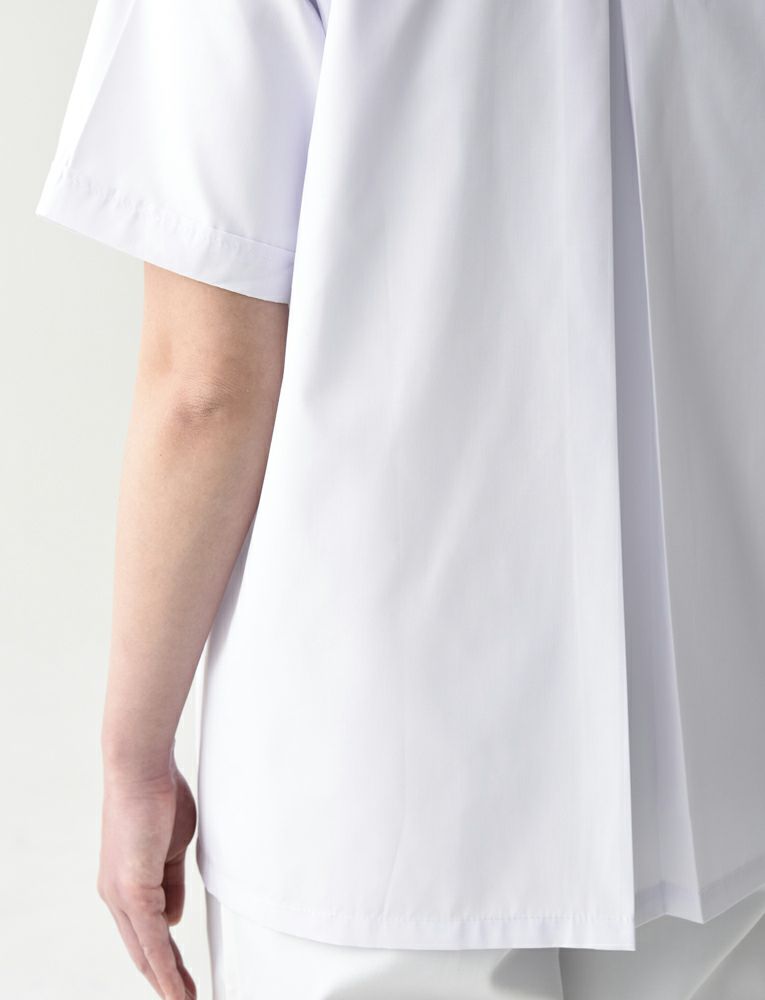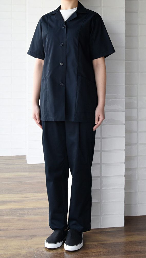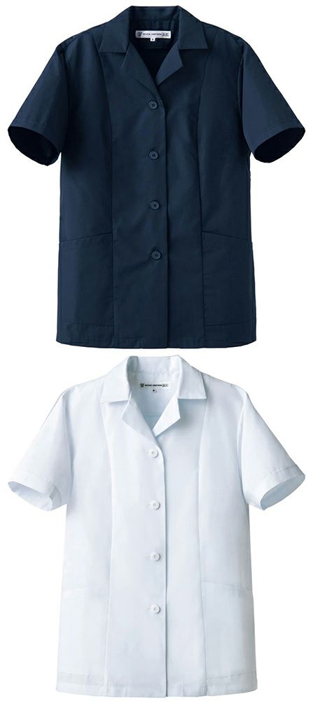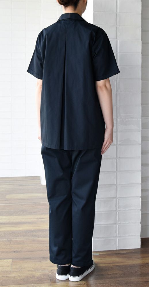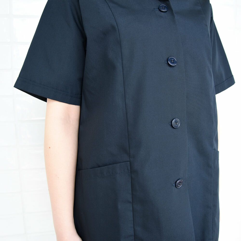 コートとしては薄手の生地、綿ポリエステル混率、平織り組織のコートです。抗菌防臭機能あり。定番的なコート生地と比べて薄手なこと、背中にプリーツがあるためたっぷりとした分量感もあり軽く動き易い。人気のネイビー色を追加しました。汚れが目立ちにくく”和”の色、藍の色としての提案です。半袖。腰に左右ポケットあり。女性用。 |