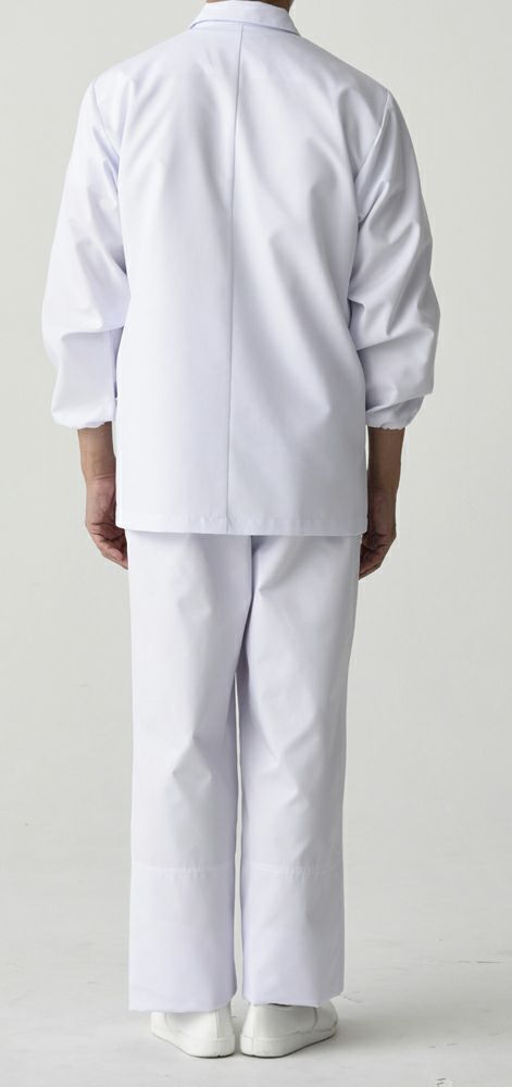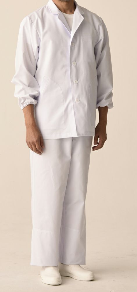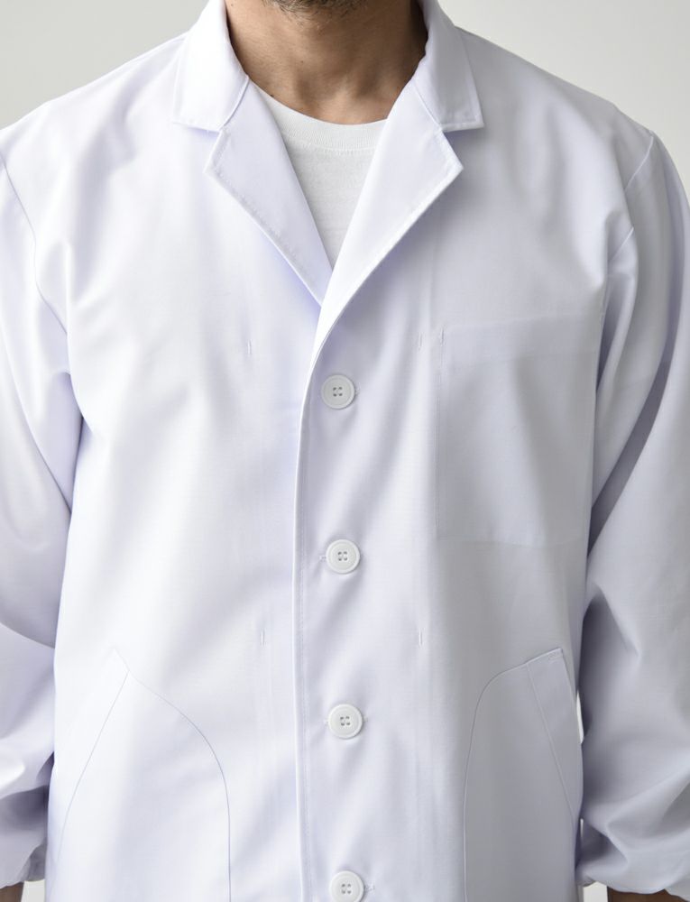 形態安定に優れた素材で作られたコート。工場洗濯にも強く型崩れやシワ、縮みなどはほとんどなく、ノープレスで美しく仕上がります。もしプレスする際は低温110℃以下であてて下さい。デザインはシンプル、左右腰にポケットあり。左胸には内側にポケットあり。袖口ゴム仕様ですので好きな位置に上げて止めることが出来ます。吸水速乾あり。SR機能あり(汚れが付いても落としやすい)。男性用。 |