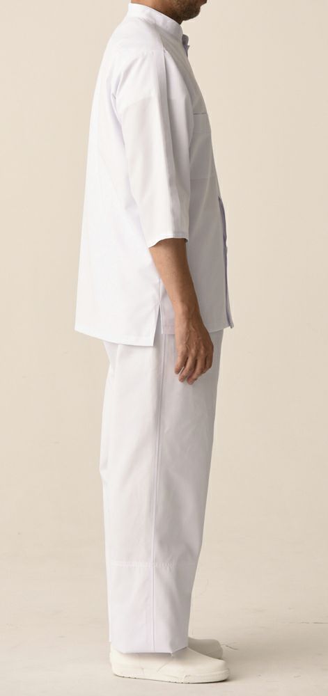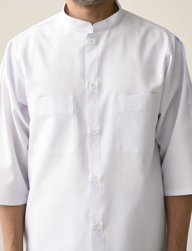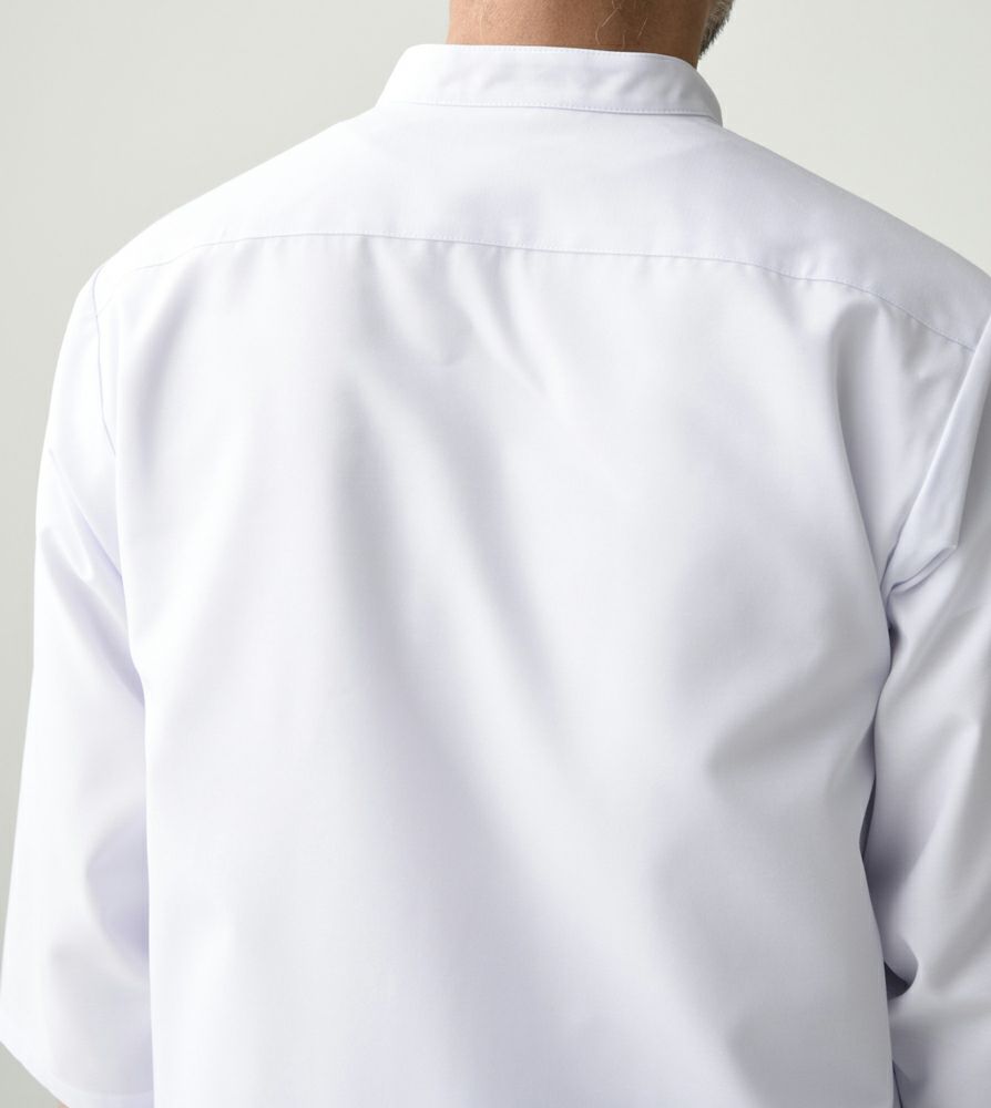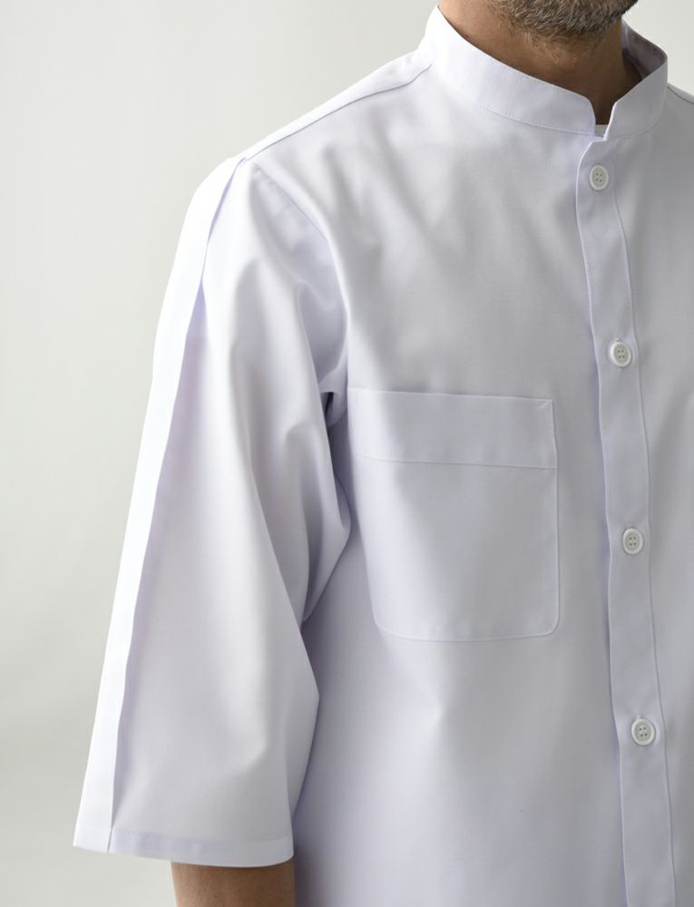 形態安定に優れた素材で作られたコートです。工場洗濯にも強く型崩れやシワ、縮みなどはほとんどなく、ノープレスで美しく仕上がります。もしプレスする際は低温110℃以下であてて下さい。スタンドカラー7分袖というデザインが専門性の高さとこだわりを感じさせ、実際に調理人から接客まで幅広いシーンで使用されています。袖には肩から袖口までタックディティールがラインのように入っているので、横の姿にも専門性やこだわりを感じさせます。左右胸にポケットあり。吸水速乾あり。SR機能あり(汚れが付いても落としやすい)。男性用。 |