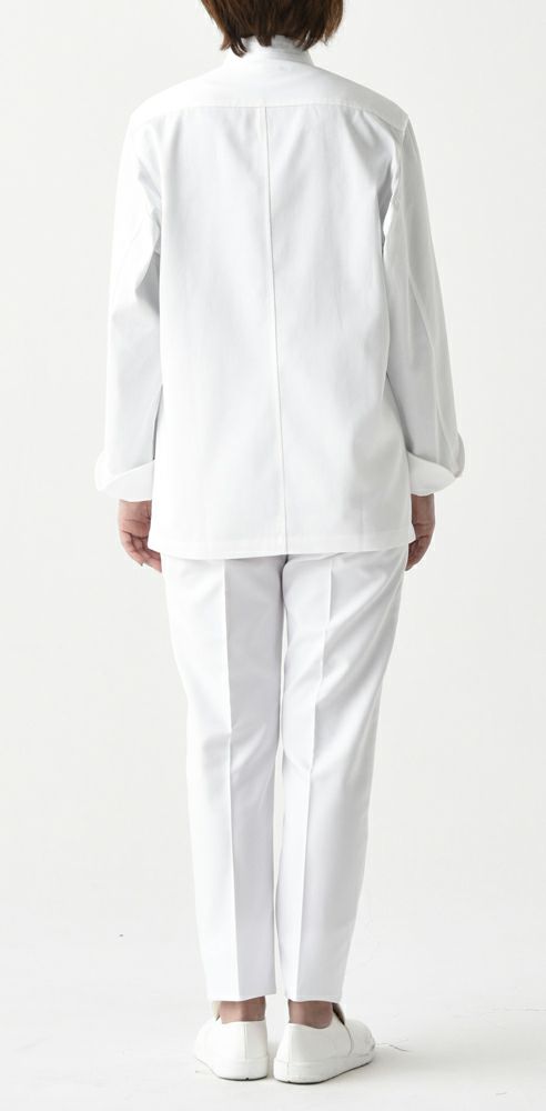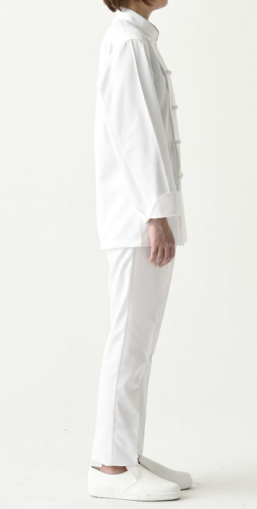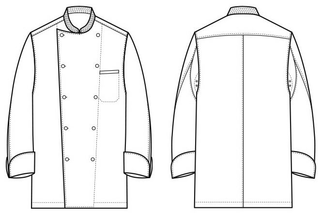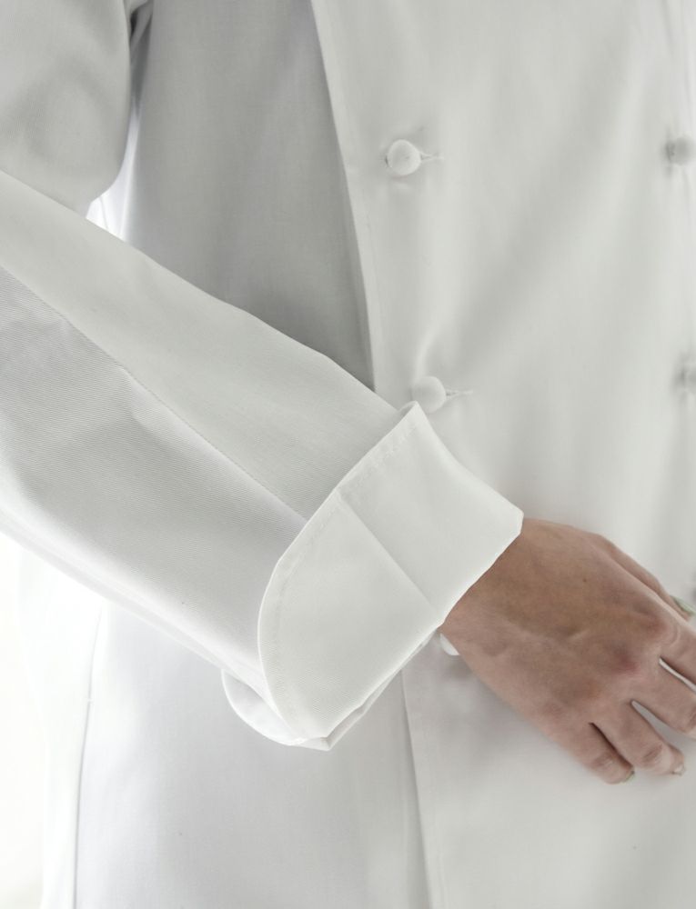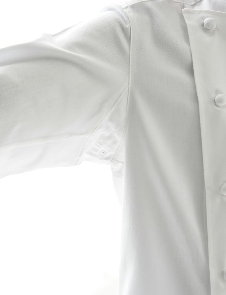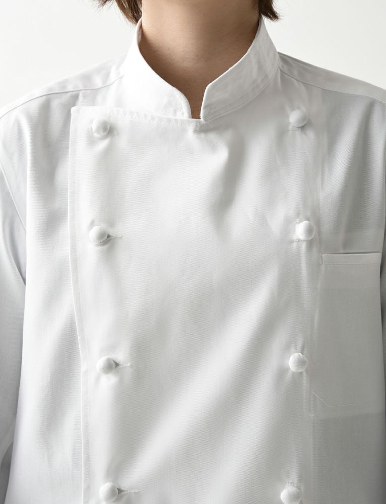 定番型クラシックコックコートの中では最もスタイリッシュなコートの1つです。袖下に大きなマチとベンチレーション機能の為に菊穴が施され、腕が動き易く、コート内の熱を多少ですが放出することが出来る機能的コックコート。丸カット・スリット入りの袖口は、伸ばした状態で長袖丈になります。共布くるみボタンですので高級感も溢れます。全体的なシルエットは他のコックコートと比較し、ゆとりの考えかたによるカッティングの違いがスタイリッシュさを生み出したコートです。着用するとより違いを感じます。 |
