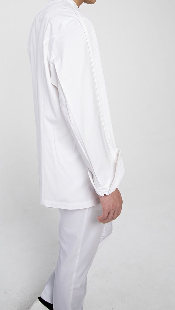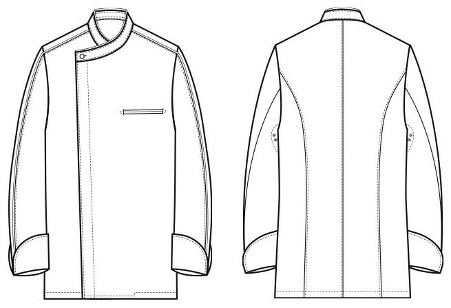 左胸両玉縁ポケット、内掛けボタン、共布くるみボタン、袖脇下菊穴・マチ付 |