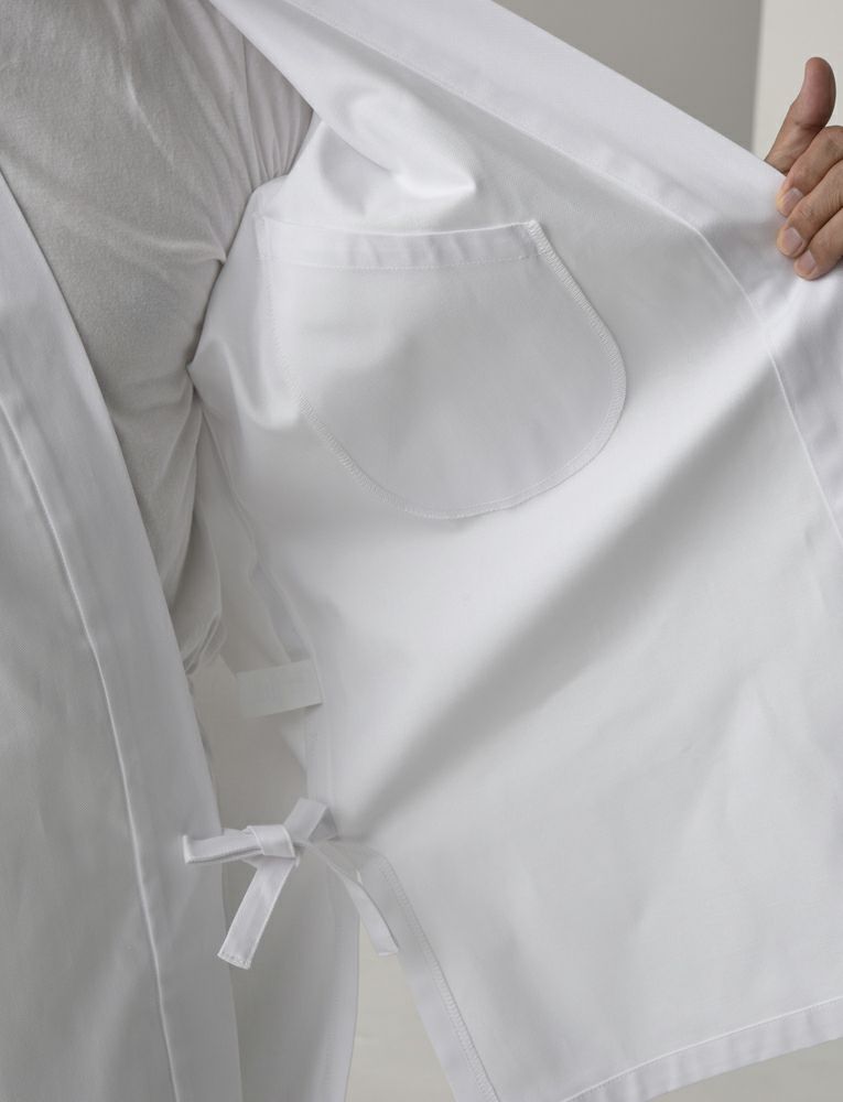 昔ながらの綿100%でしっかりとした厚手の生地で作られた法被(ハッピ)をベースにしたハッピーコートです。最初は硬く感じる生地ですが使っていくうちに馴染んでいきます。白のベーシックなデザインというところがポイントです。定番アイテムですので多くのシーンに合わせやすいものになっています。左胸内側にはポケットあり。裾にはスリットあり動き易くなっています。制菌の機能が付いています。男性用。 |