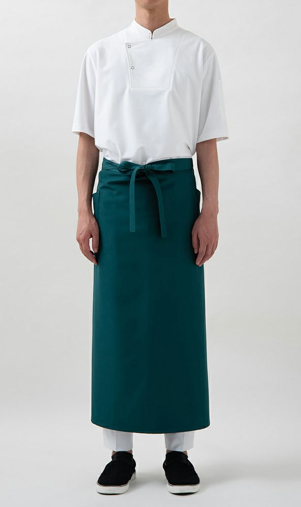 ベーシックな形の制電素材でほこりがつきにくく、漂白剤に強い、退色防止加工のロング丈ソムリエエプロンです。