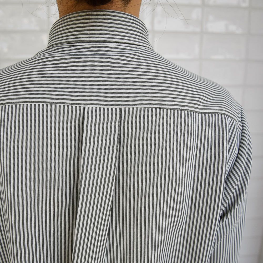 ニュースタンダードシャツとして開発したジャージ素材のB.D長袖ストライプ定番シャツです。生地は柔らかくストレッチがあり快適、整えて干せばアイロン不要です。スーツ合わせもでき、裾を出してカジュアルにも着こなせます。吸水速乾機能付き。カッティングは大は小を兼ねる従来のユニフォームシルエットから脱皮し、適度にフィットするシルエットになっています。色はホテル・レストランの色々なコンセプトに合うよう3色を展開しています。 |