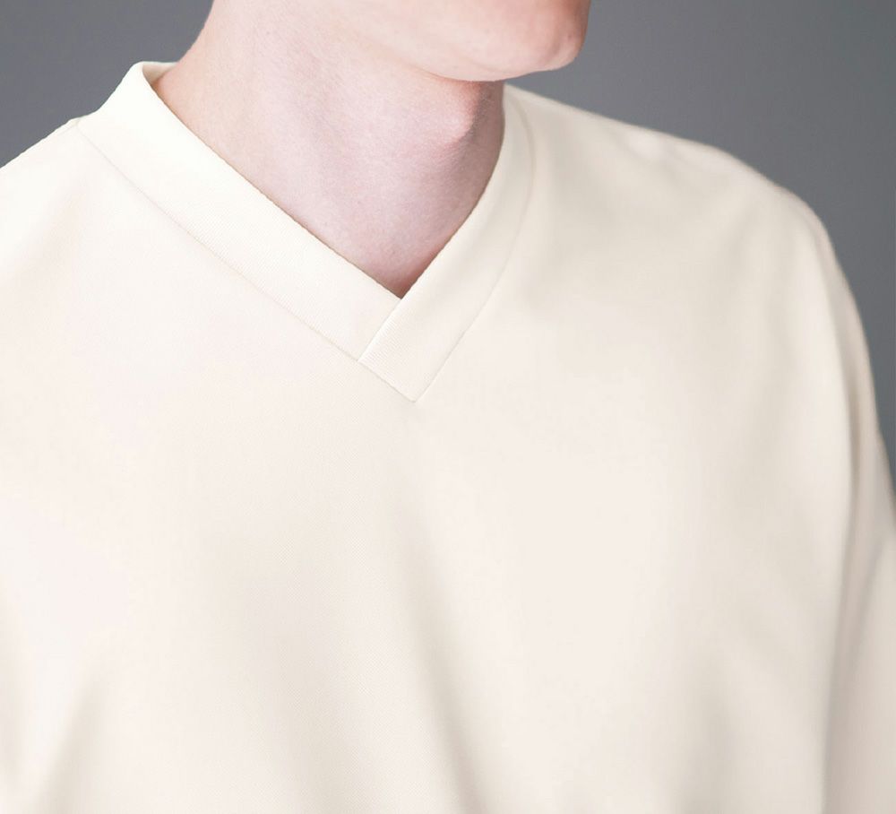 シリーズ展開になっています。ボディー全て同じカッティングの長袖・半袖展開(サルエルパンツは別)。衿のみデザイン違いの5色展開(白とアイボリーは別)です。セクションで衿・色分けなども出来、まとまりのある空間作りも簡単に出来ます。 |
