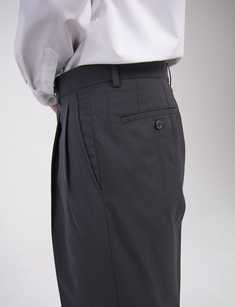 毛とポリエステル混紡糸の高級スーツ生地で作られたパンツです。同素材でホテル・レストラン向けのジャケットが数型あり、それとわせるパンツです。ツータックですのでゆったり目のシルエットです。 |