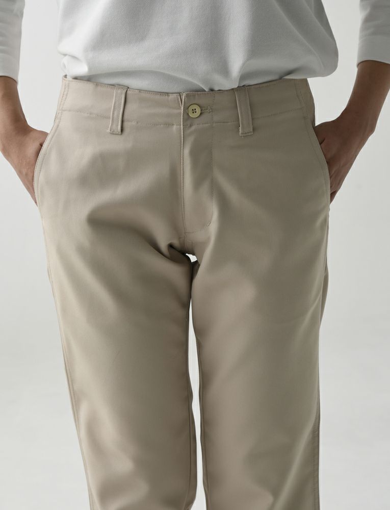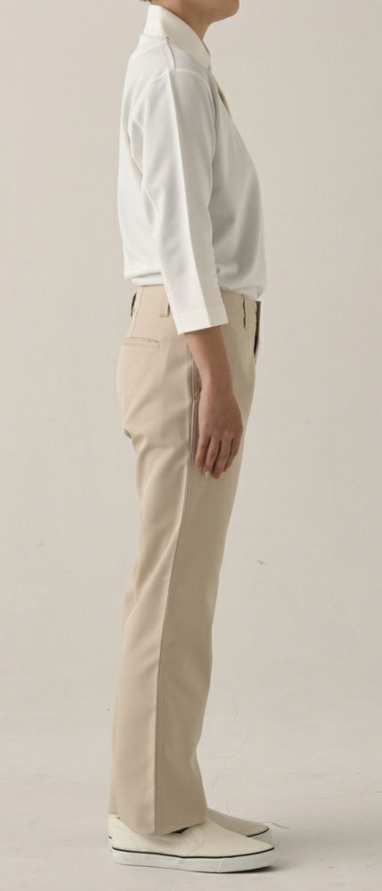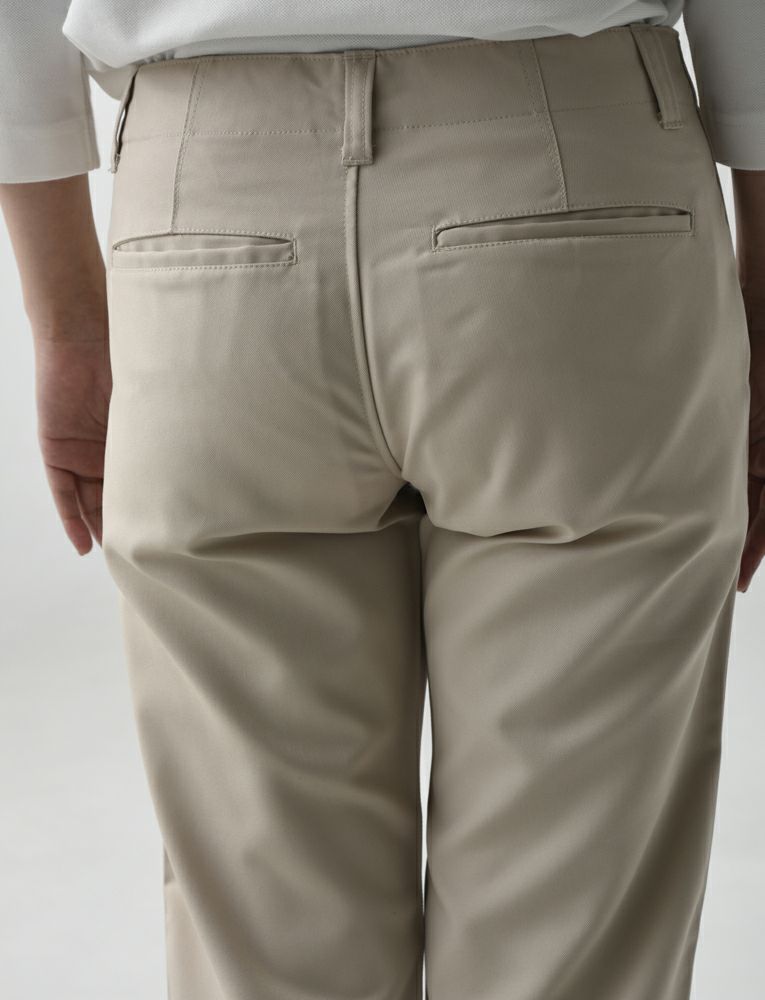 特徴 ローウエスト、ブーツカットのチノパンです。ほのかなブーツカットですので着用するとほぼストレートに見えます。ストレッチ入りです。