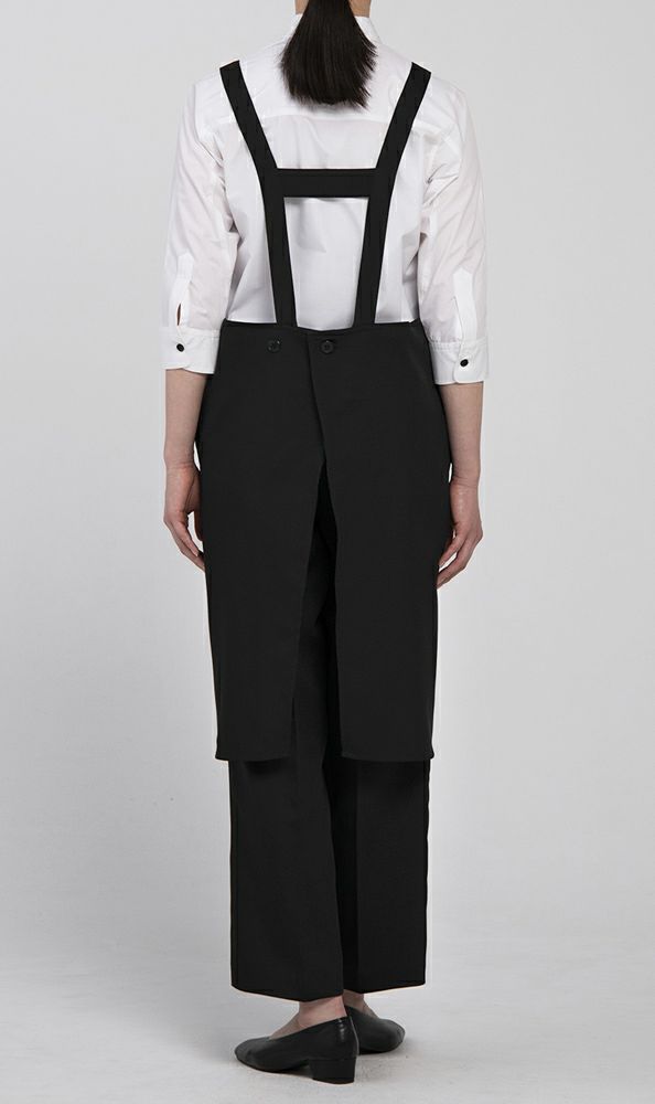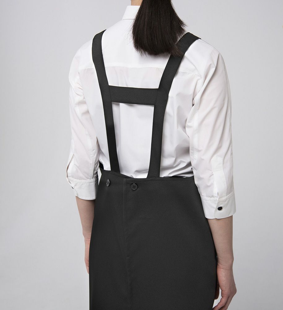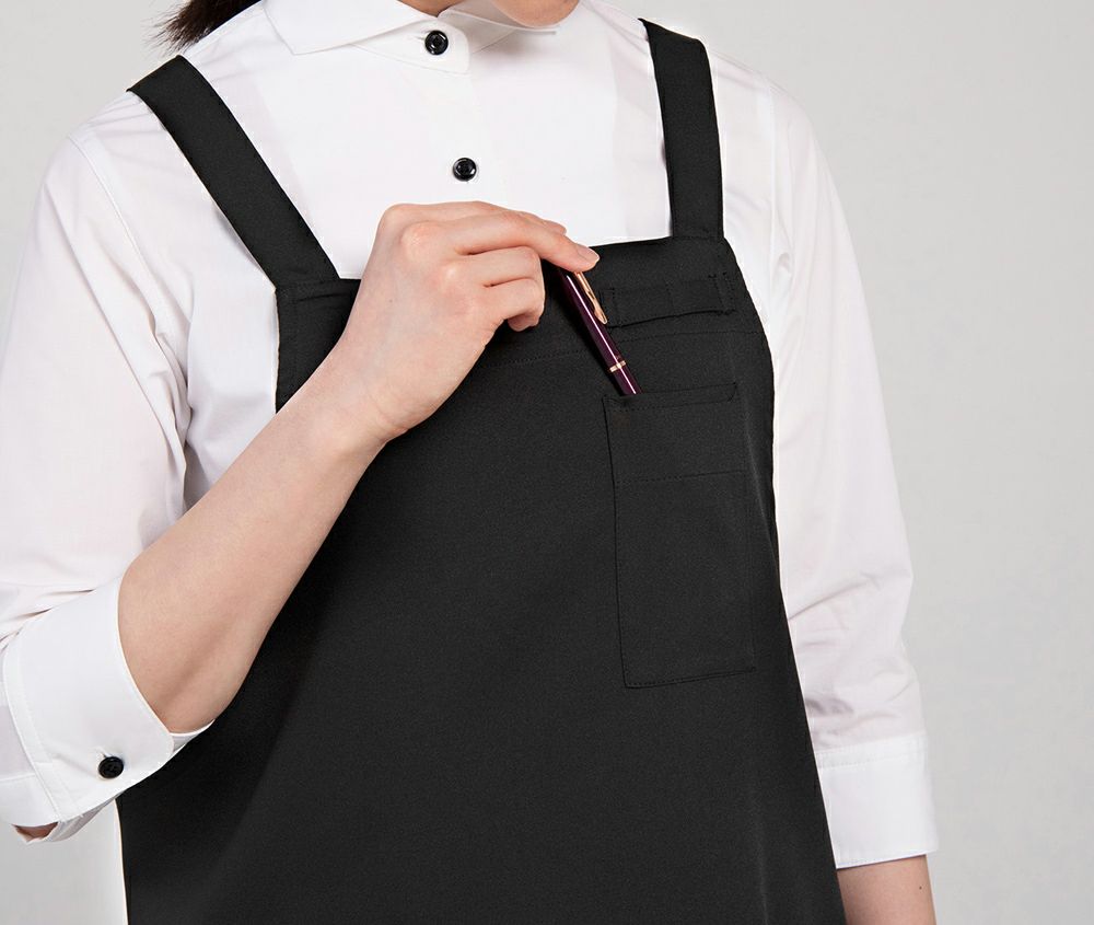特徴 黒原着糸を使用した生地ですので塩素や日光、経年での色落ちはほぼしません。永くきれいな黒のまま使用出来ます。生地の表情、ドレープ感が豊かですのでシンプルなエプロンですが着用時の高級感はとても高いものになっています。制電糸、ストレッチ有りですので清掃、物販、サービスまで、コーディネート次第で多くのシーンに合わせることが出来ます。エコに関して、黒原着糸を作る際に水をほとんど使用しません。また色含めポリエステル100%ですので耐久性も高く、永く着用することもエコにつながると考えています。