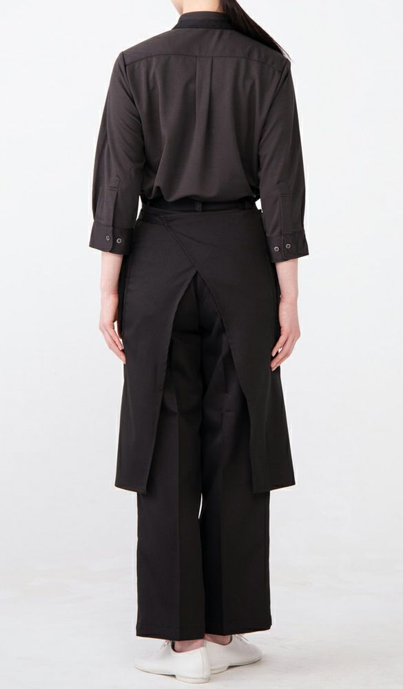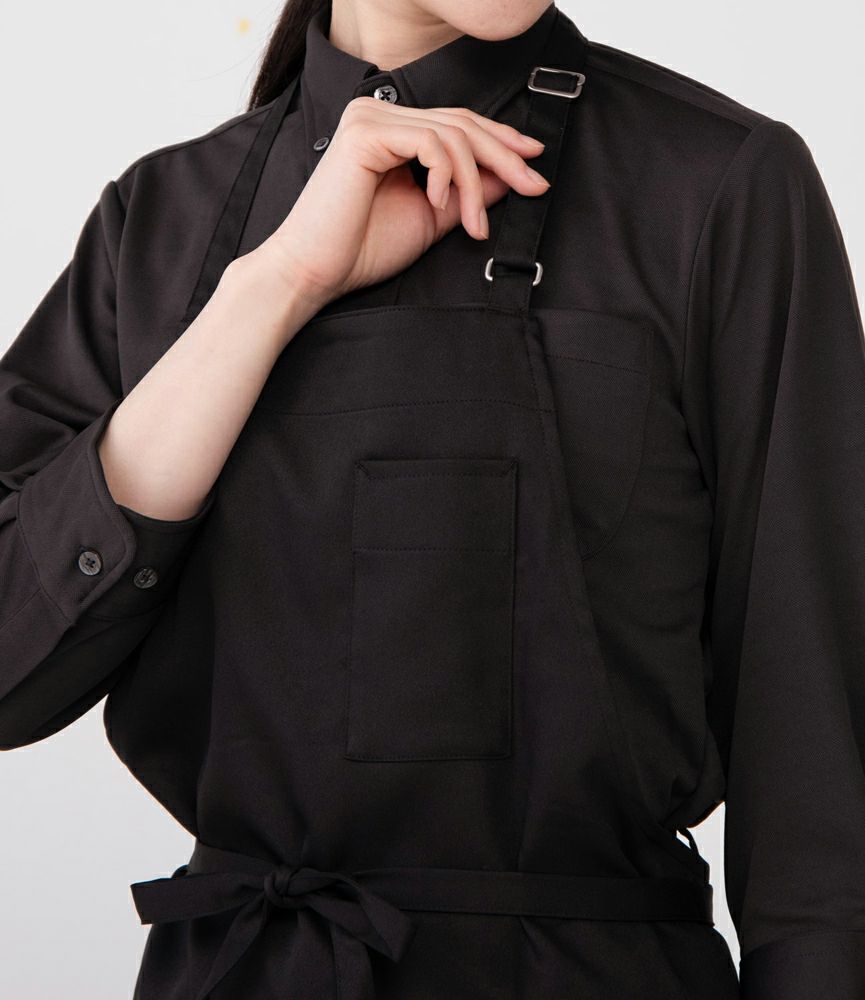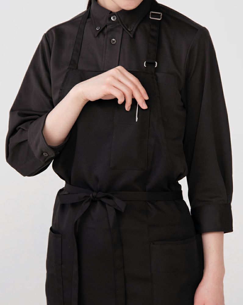 特徴 黒原着糸を使用した生地ですので塩素や日光、経年での色落ちはほぼしません。永くきれいな黒のまま使用出来ます。生地の表情、ドレープも豊かですのでシンプルなエプロンですが着用時の高級感はとても高いものになっています。制電糸、ストレッチ有りですので清掃、物販、サービスまで、コーディネート次第で多くのシーンに合わせることが出来ます。エコに関して、黒原着糸を作る際に水をほとんど使用しません。また色含めポリエステル100%ですので耐久性も高く、永く着用することが出来ることもエコにつながると考えています。