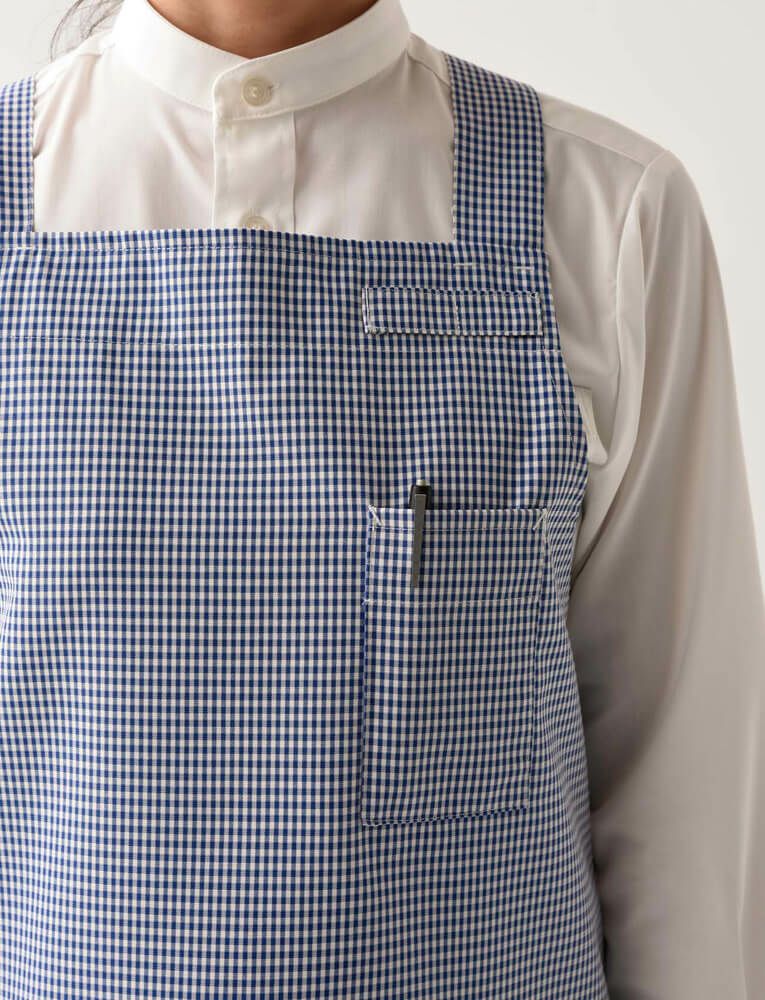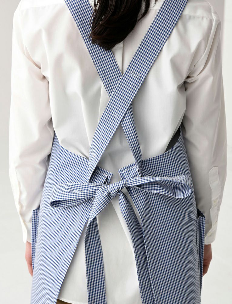 吸水速乾でシワになりにくい形態安定のギンガムチェック柄胸当て背中クロスエプロンです。