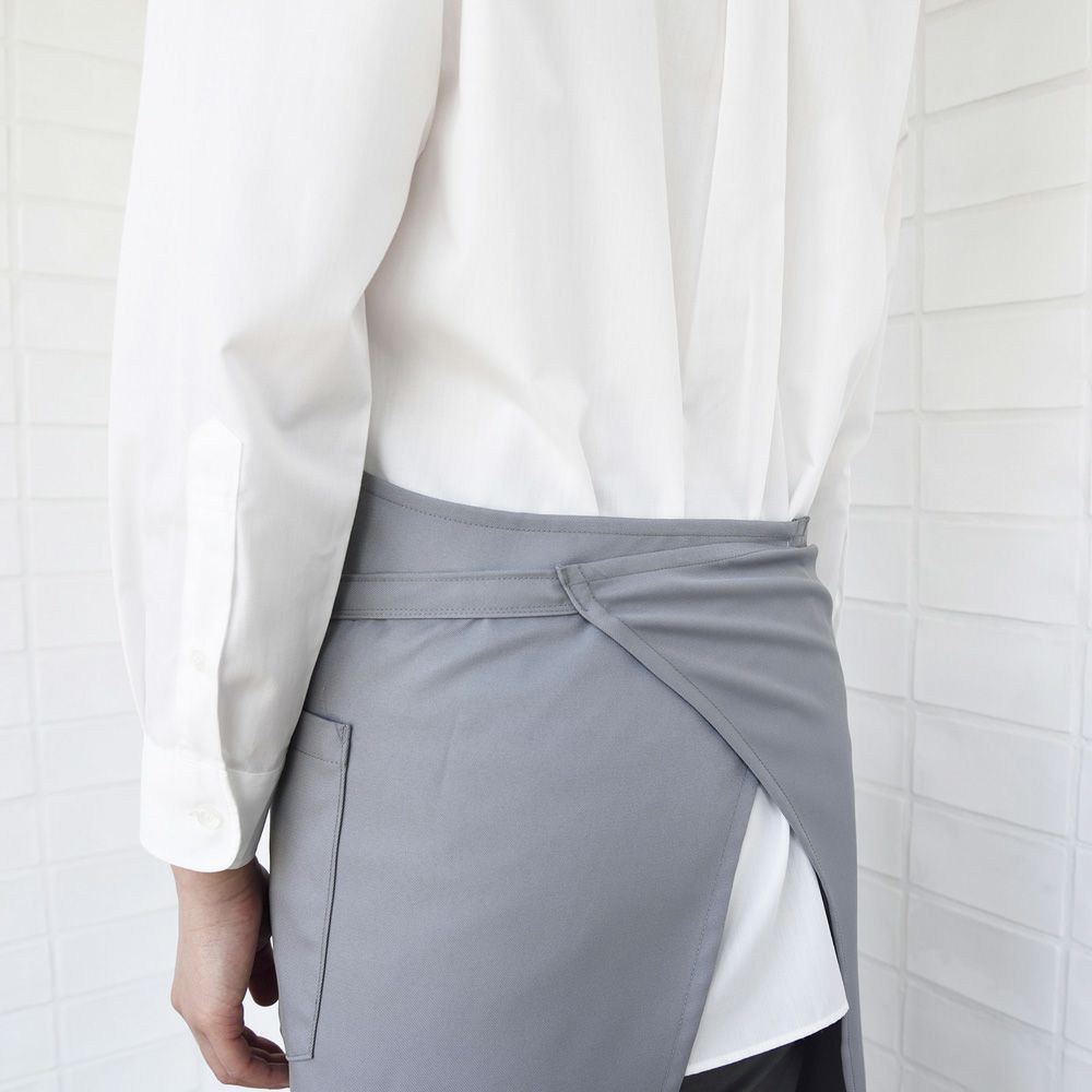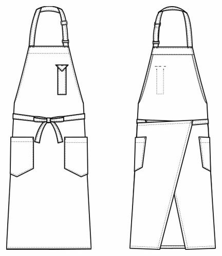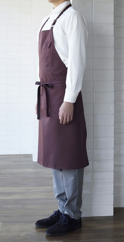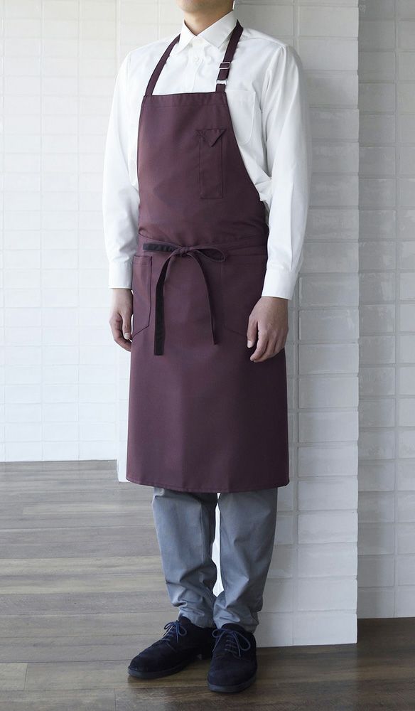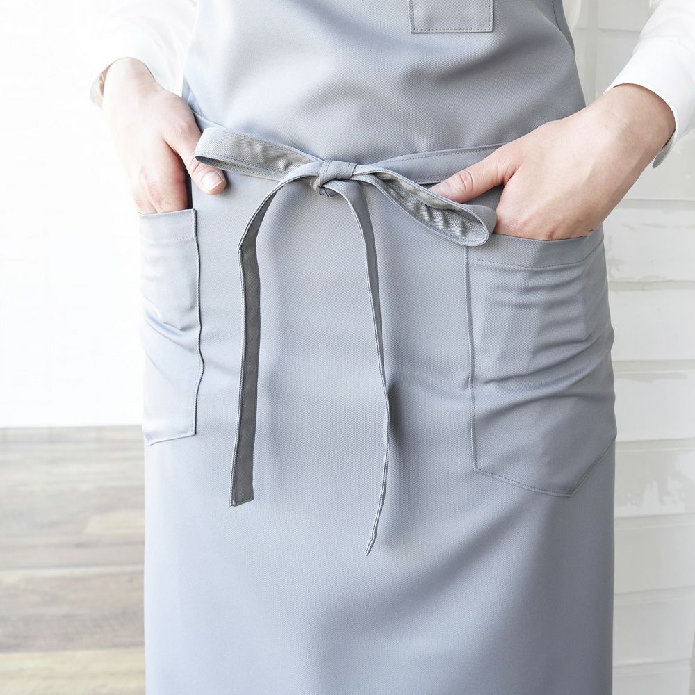 男女ともに着用しやすくスタイリッシュなミドル丈タイプの首掛け胸当てエプロンです。