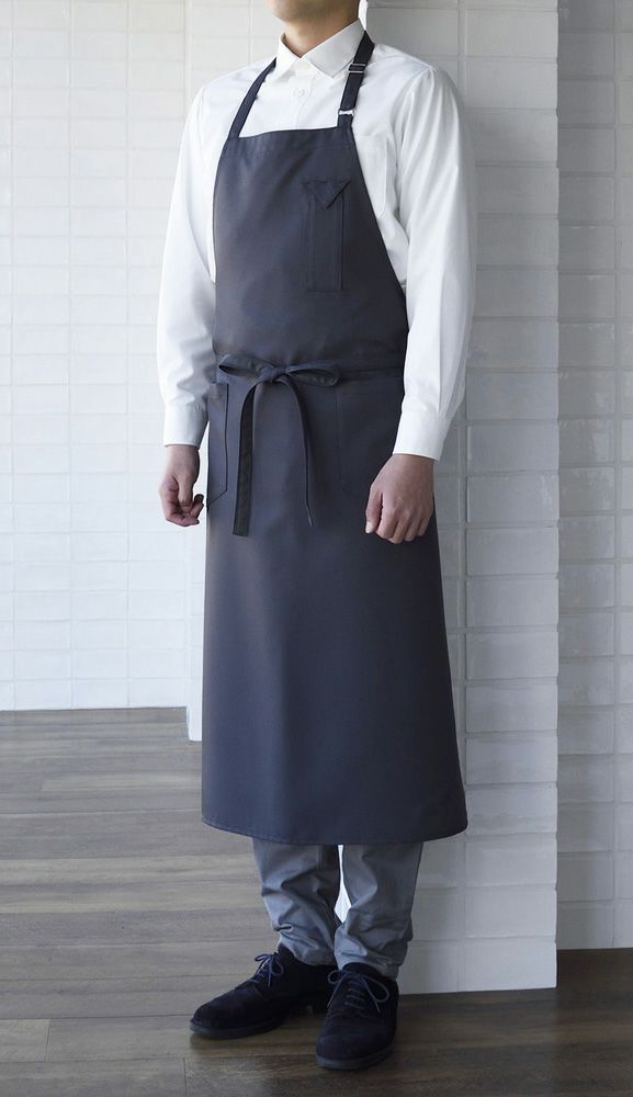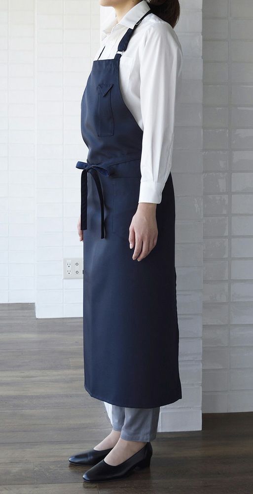 ロング丈で着用するだけでスタイリッシュな着こなしのできる首掛けエプロン。