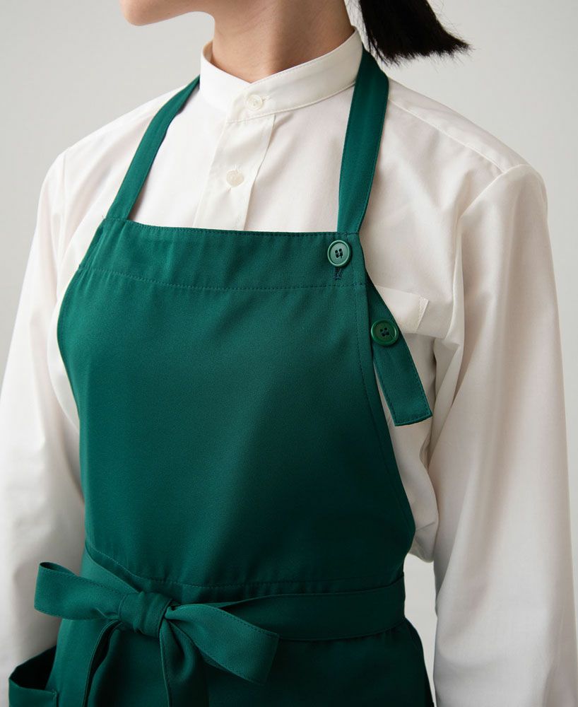 制電素材で定番の首掛け胸当てエプロンは、店舗イメージを選ばず、幅広くお使いいただけます。
