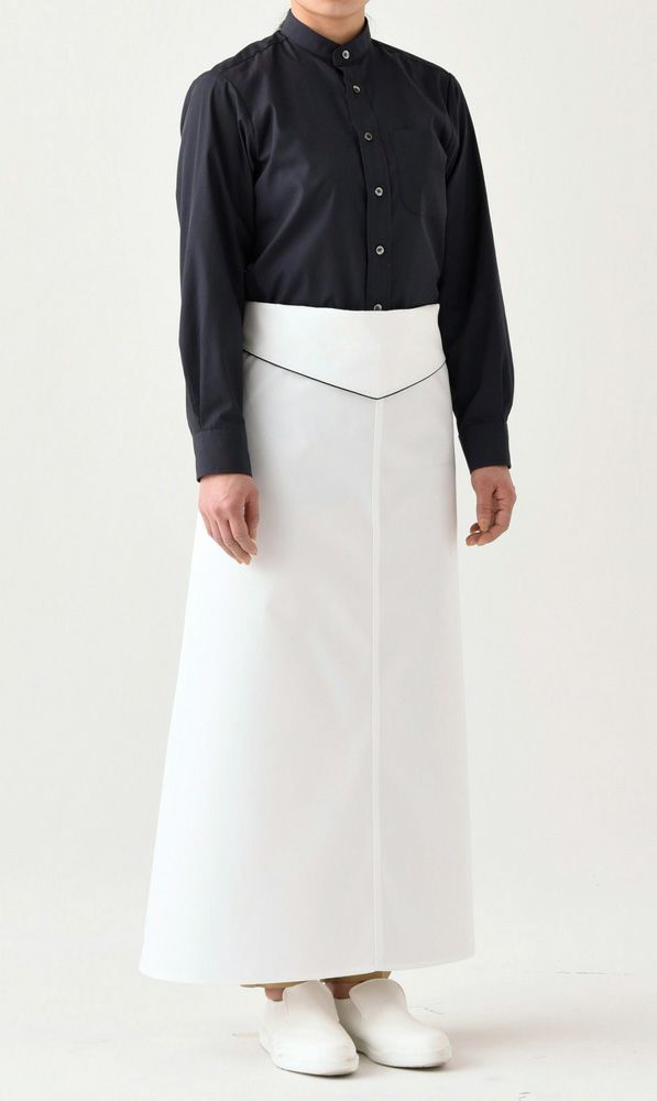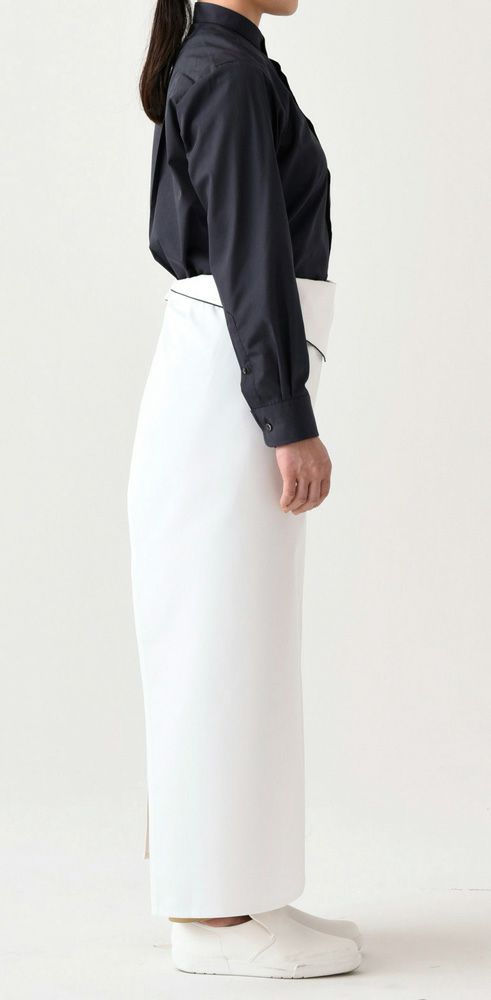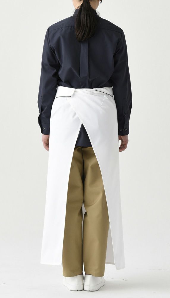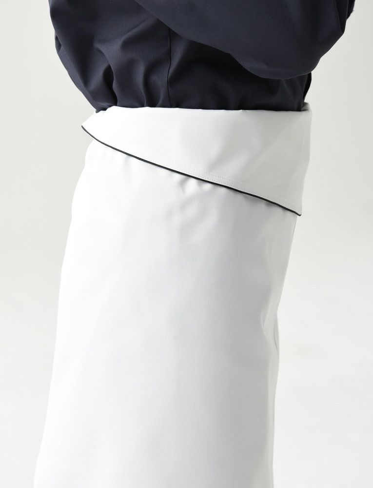 折返しの黒のパイピングが白いエプロンを引き立てるポイントとなります。腰の折り返しがし易いように改良しており、後姿も美しさを追求して、折り返し部分が重なってごわつかない様に改良しています。
