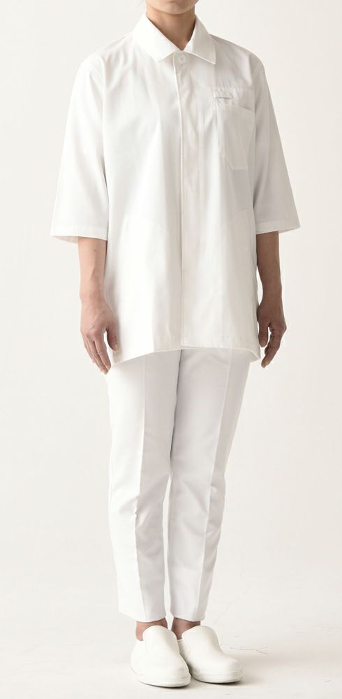 特徴 ステンカラー7分袖コート、半袖アンダーカバー付き。アンダーカバーの袖口は幅広のゴム仕様です。生地は撥水撥油、抗菌防臭機能付きです。左胸にはペン刺し、もしくはネームチーにも使えるループがあり、その下にポケットもあります。両サイドの腰にもポケットあり。背中には大きめのアクションプリーツもありますのでゆったりと着用出来ます。