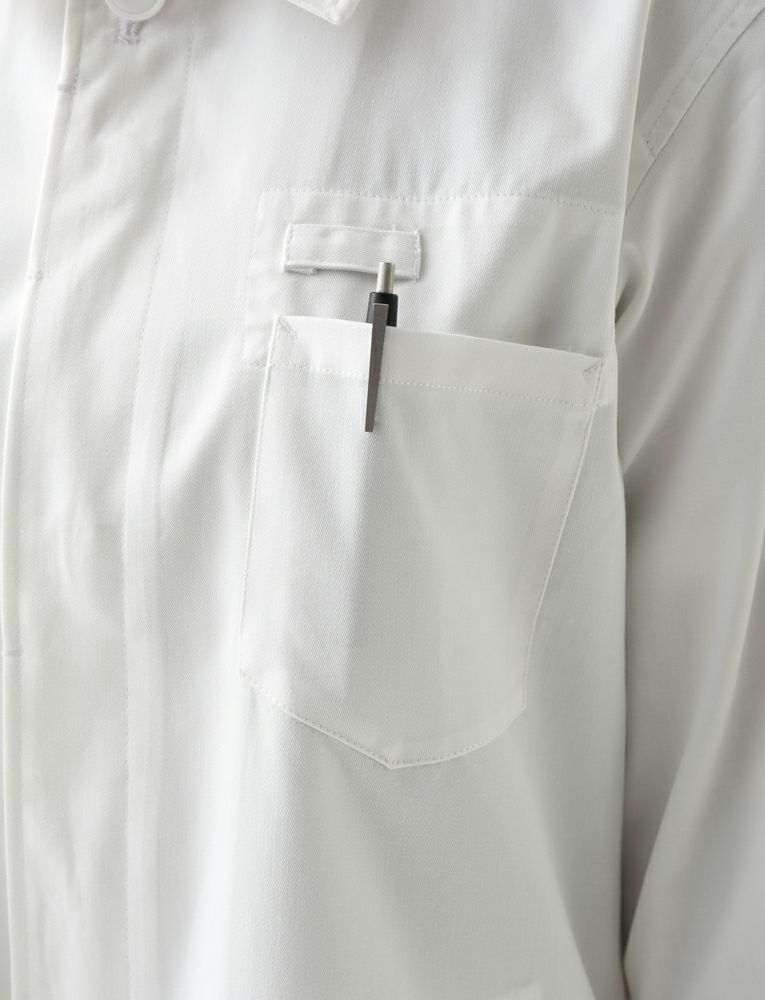 機能 抗菌・防臭、撥水・撥油、左胸ペン差しループ付、半袖アンダーカバー付、後アクションプリーツ入