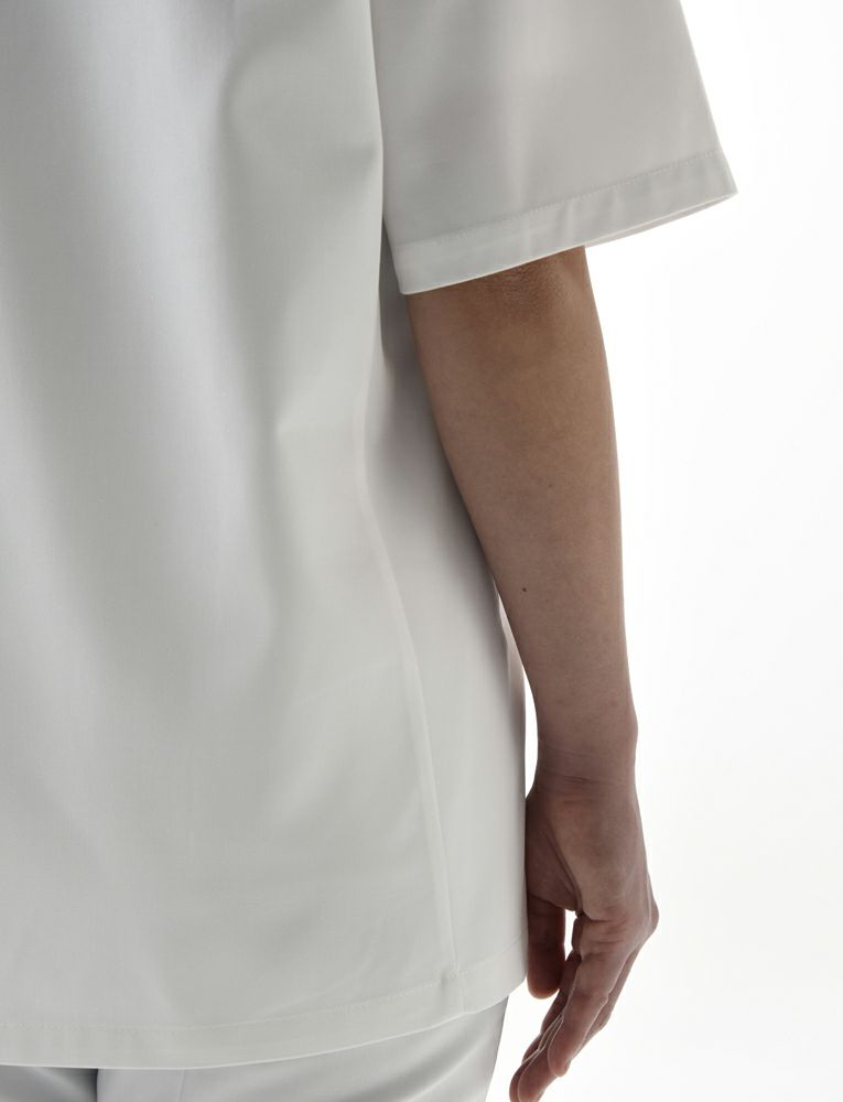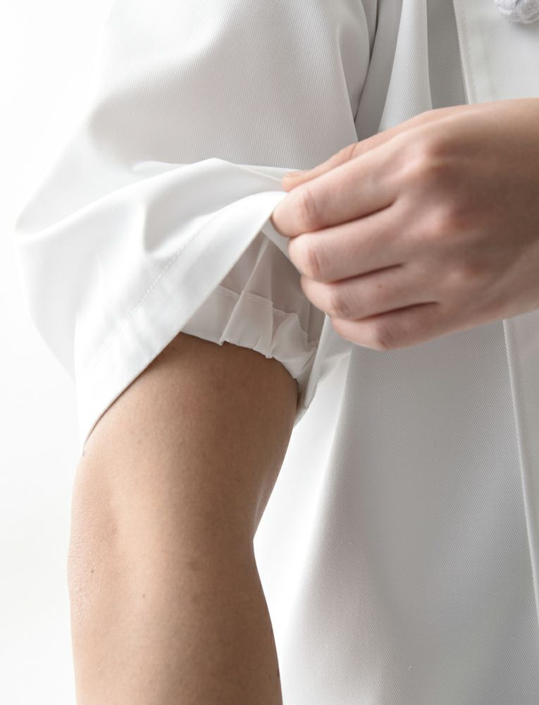 特徴 定番半袖コックコートAA499-0の袖口アンダーカバー仕様のアイテム。袖の内側に別布袖があり袖口は幅広のゴムで絞る仕様になっています。異物混入を防ぐ衛生的な仕様になっています。