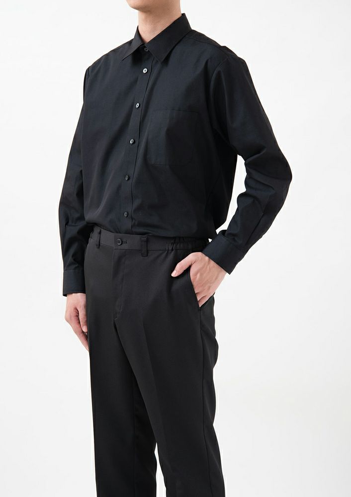 黒原着糸を使用した生地により塩素や日光、経年での色退色がほとんどないという大きな特徴があります。永くきれいな黒色のまま使用出来ます。生地の表情も豊かですのでシンプルなパンツですが着用時の高級感はとても高く、スーツの組下のようなパンツです。制電糸、脇ゴム、ストレッチの有る生地ですので清掃、物販、サービスと多くのシーンで活用出来ますし、特に接客に重きを置くサービスには適しています。エコに関して、黒原着糸を作る際に水をほとんど使用しません。また色含めポリエステル100%ですので耐久性も高く、永く着用することが出来ることもエコにつながると考えています。 |