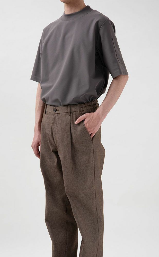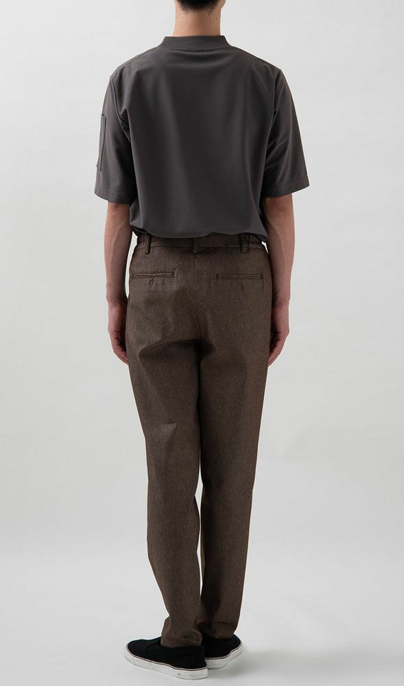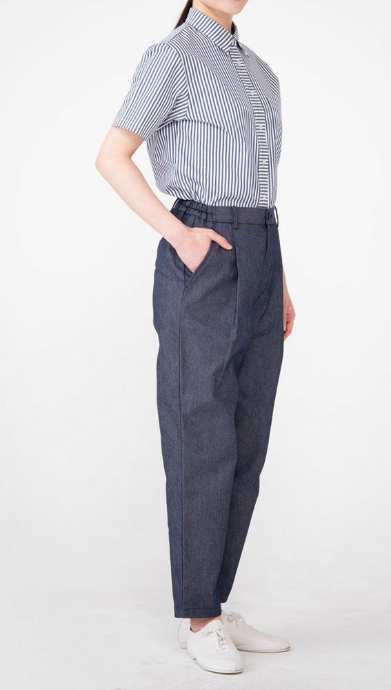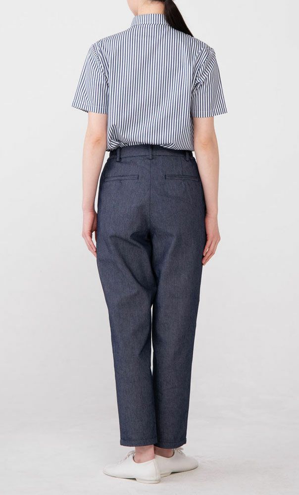 経年劣化しない麻調デニム生地が特徴です。綿デニムのような色落ちがほぼ無いのでいつまでもきれいな色のままを保ちます。麻は入っていませんが麻のようなドライなタッチ感があることで適度な肌離れが生まれ、涼しさにつながります。また適度なハリコシは着用時に高級感を表現し、生地の厚さは耐久性を生み出し、永くきれいな状態を保ちます。ワンタックのゆったりテーパードシルエット、脇ゴム入り。ストレッチもありますのでストレスの無い履き心地を体感できます。色々な新しいコンセプトが生まれてくる中、色展開もそういったシーンにマッチする3色を用意しています。 |