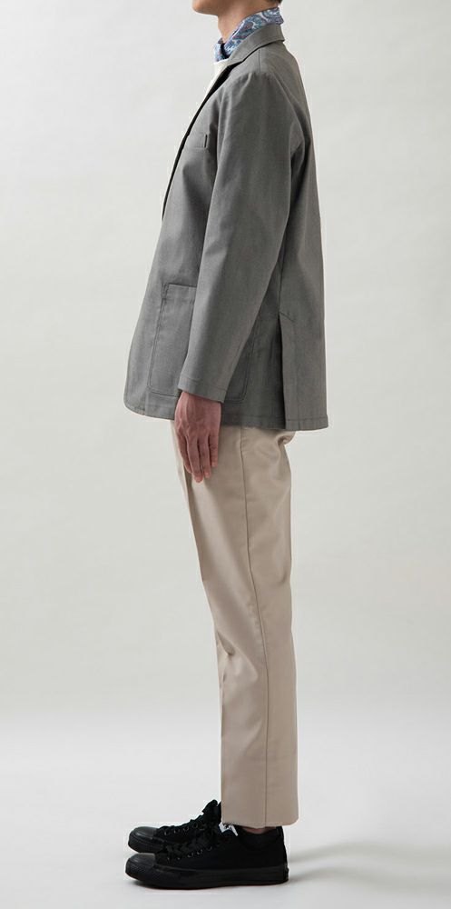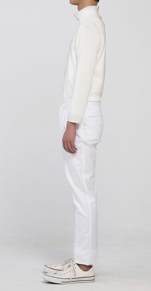 特徴 毛混ではないスーツ合わせのパンツを開発しました。ポリエステルと綿で出来たツイルパンツです。ほのかなストレッチ、制電糸入り、白のみSR(汚れ落ちやすい)機能あり。テーパード、細身のシルエット、モダンな高級スーツと合わせるパンツのようなシルエットです。とてもスタイル良く映ります。生地感は最初はハードですが、履きこなしていくうちに馴染んできます。同素材のジャケット(DD2764)がありますのでスーツとしての着用も出来ます。これからの新しいカジュアル寄りのコンセプトを提案しているホテルやレストランにオススメです。
