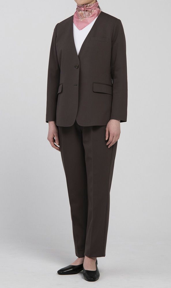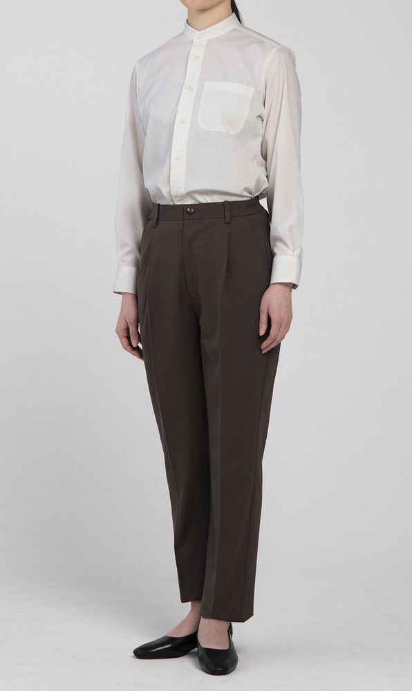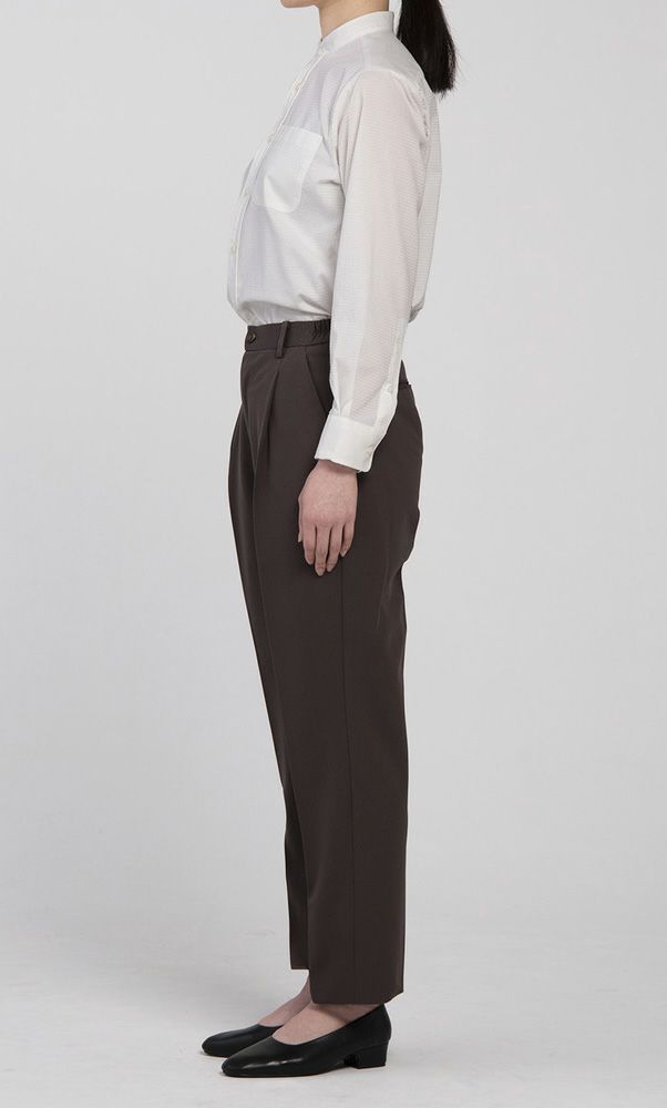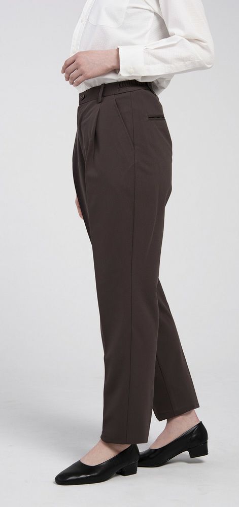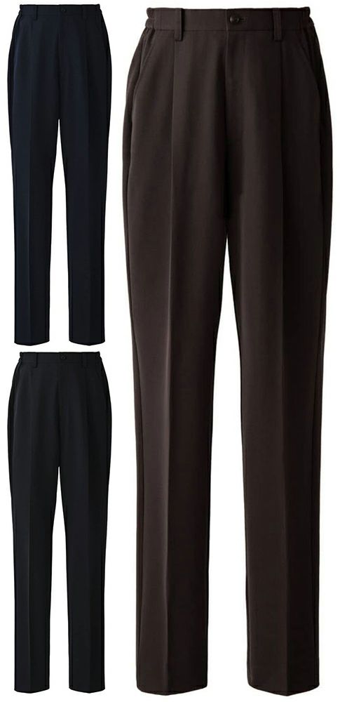 次世代ジャケットに合わせるトリコット素材の女性用パンツです。”ナチュラルフィット”というテーマのもと色々な体型であっても、よりスマートにホスピタリティーを保ちながら、且つ動き易いというスタイルを作りあげることが出来ました。オリジナルで開発したトリコット生地は耐久性が高く経編みによるストレッチ、エレガントなハリコシ、さらに軽く通気もよいので着心地が今までのものとは全く違う快適さです。カッティングにも工夫あり、ワンタックがヒップのゆとりを与え、脇ゴム入りですので履き心地がとても楽です。一部環境配慮された剤による吸水速乾機能あり、前のみですが裏地も付いていますので滑りもよく動き易いです。男女兼用のパンツのご用意もあります。比較しますとこちらの股上は深めでヒップとウエストの差寸が大きく、おおよその女性にオススメです。一度ぜひご試着し着心地と着用スタイルを体感して下さい。 |