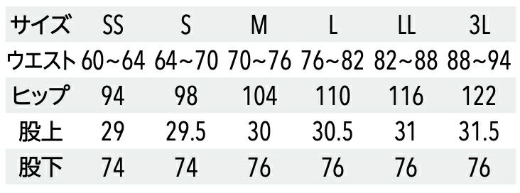 機能 前ファスナーあき、ウエストゴム・ヒモ入り、両脇ポケット、左右ヒップポケット、裏地なし、男女兼用、ストレッチ、制電、抗菌防臭