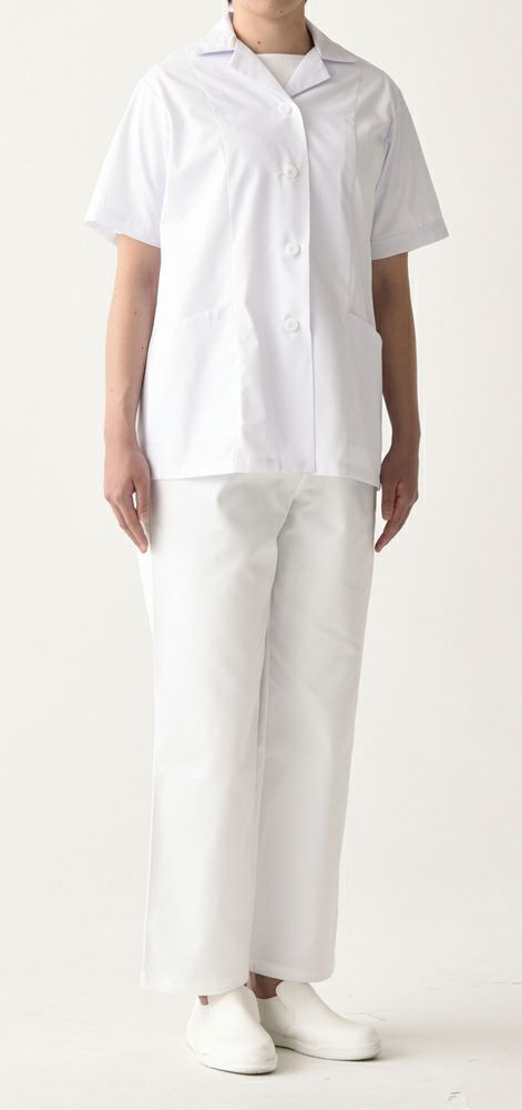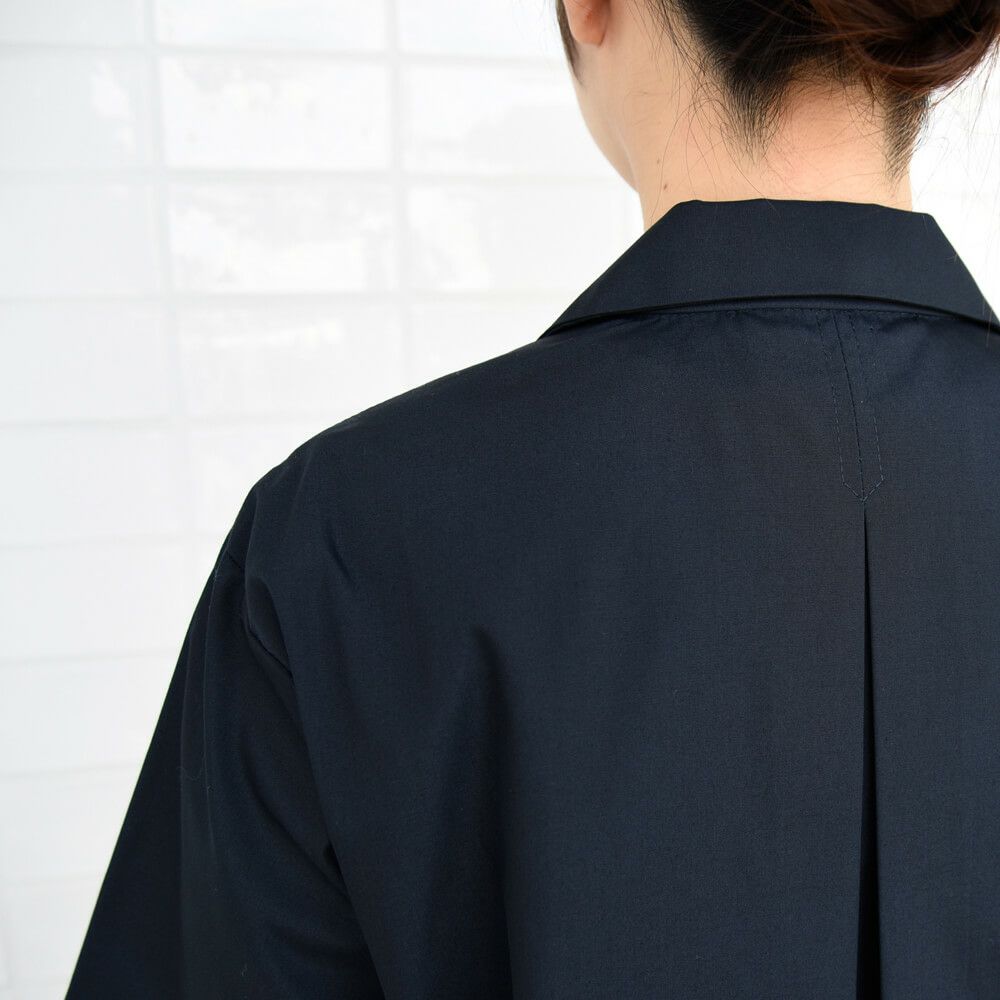特徴 コートとしては薄手の生地、綿ポリエステル混率、平織り組織のコートです。抗菌防臭機能あり。定番的なコート生地と比べて薄手なこと、背中にプリーツがあるためたっぷりとした分量感もあり軽く動き易い。人気のネイビー色を追加しました。汚れが目立ちにくく”和”の色、藍の色としての提案です。半袖。腰に左右ポケットあり。女性用。