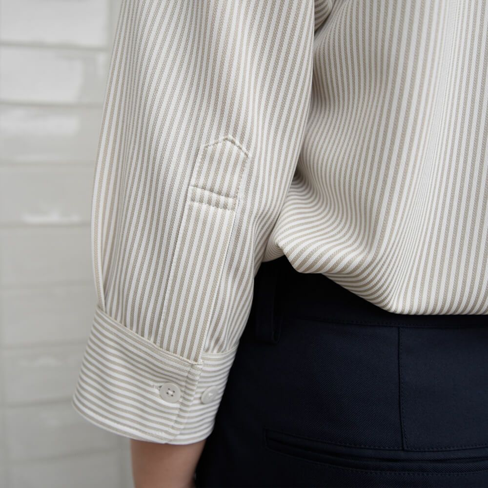 特徴 ニュースタンダードシャツとして開発したジャージ素材のB.D7分袖ストライプ定番シャツです。生地は柔らかくストレッチがあり快適、整えて干せばアイロン不要です。スーツ合わせもでき、裾を出してカジュアルにも着こなせます。吸水速乾機能付き。カッティングは大は小を兼ねる従来のユニフォームシルエットから脱皮し、適度にフィットするシルエットになっています。色はホテル・レストランの色々なコンセプトに合うよう3色を展開しています。