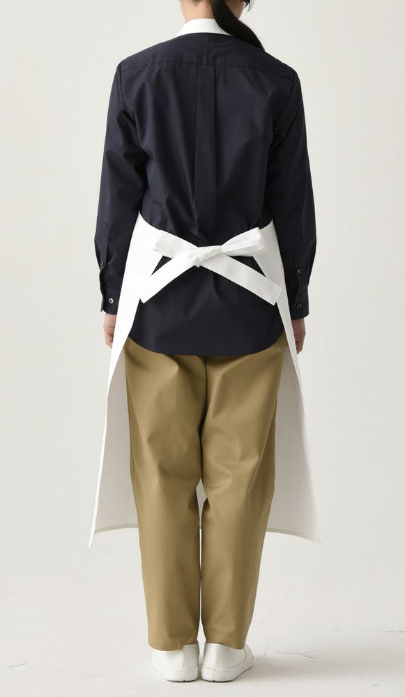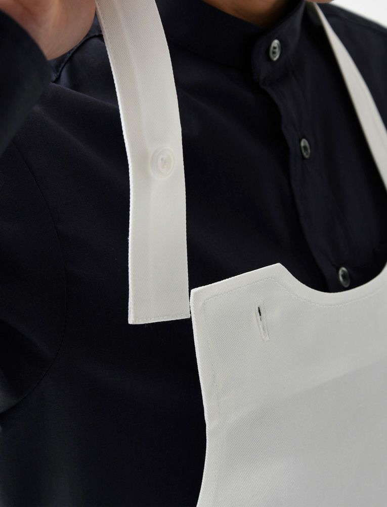 ポケット付きでシンプルな首掛け前掛けは、綿100%で揚げ物調理やホールスタッフにおすすめです。
