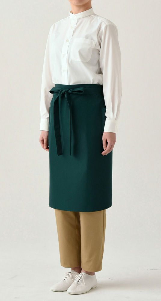 ベーシックな形の制電素材でほこりがつきにくく、漂白剤に強い、退色防止加工のミドル丈エプロンです。