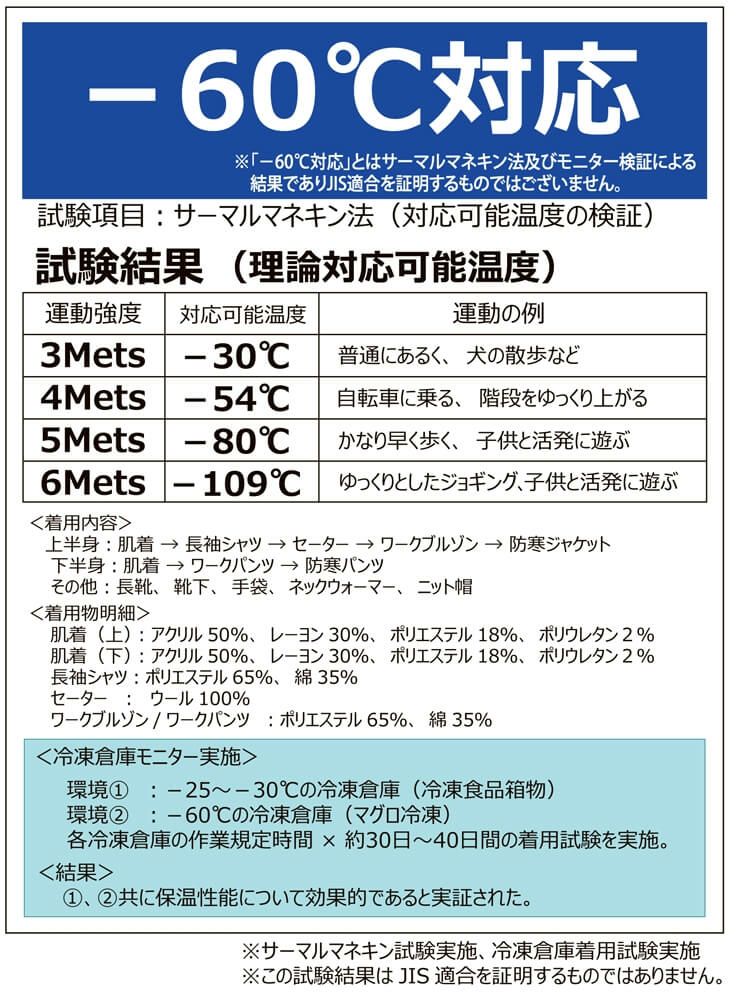 ※ 「-60℃対応」とはサーマルマネキン法及びモニター検証による結果であり JIS適合を証明するものではございません。