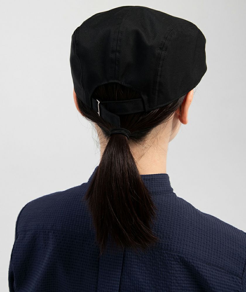 ハンチングの定番、色も白と黒のみ。後ろに調整のバックルが付いています。生地は撥水撥油、抗菌防臭機能があります。 |