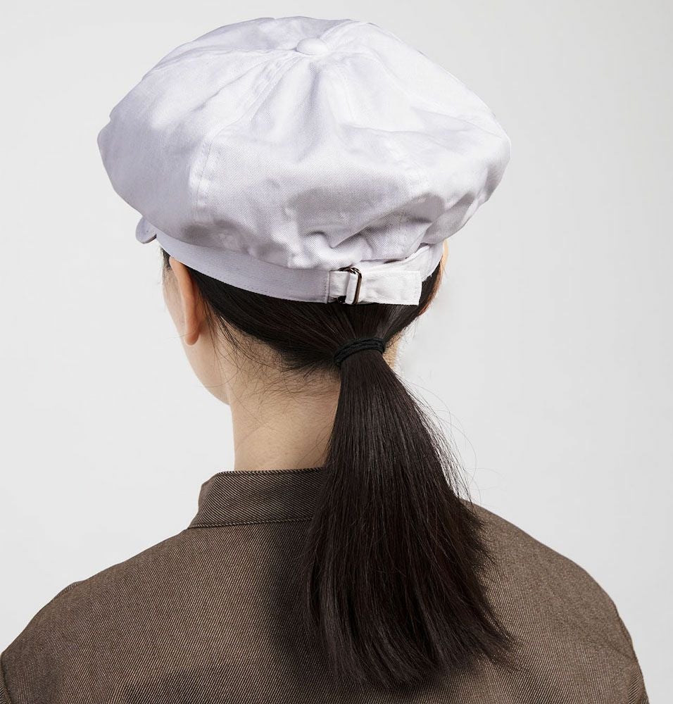 綿100%キャスケットはこの品番のみです。ポリエステルの製品が多い中、貴重なアイテムです。手仕事が多いこだわりのシーンなどに合うと思います。後ろにバックル調整付き。 |