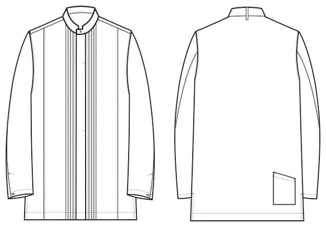 袖口を折り上げてカフスのようにしたり、エプロンやタイの紐を通すことが出来る後襟ループが付いています。左後ろに配した名刺入れポケットは、一般的なスマートフォンを収納できる大きさです。