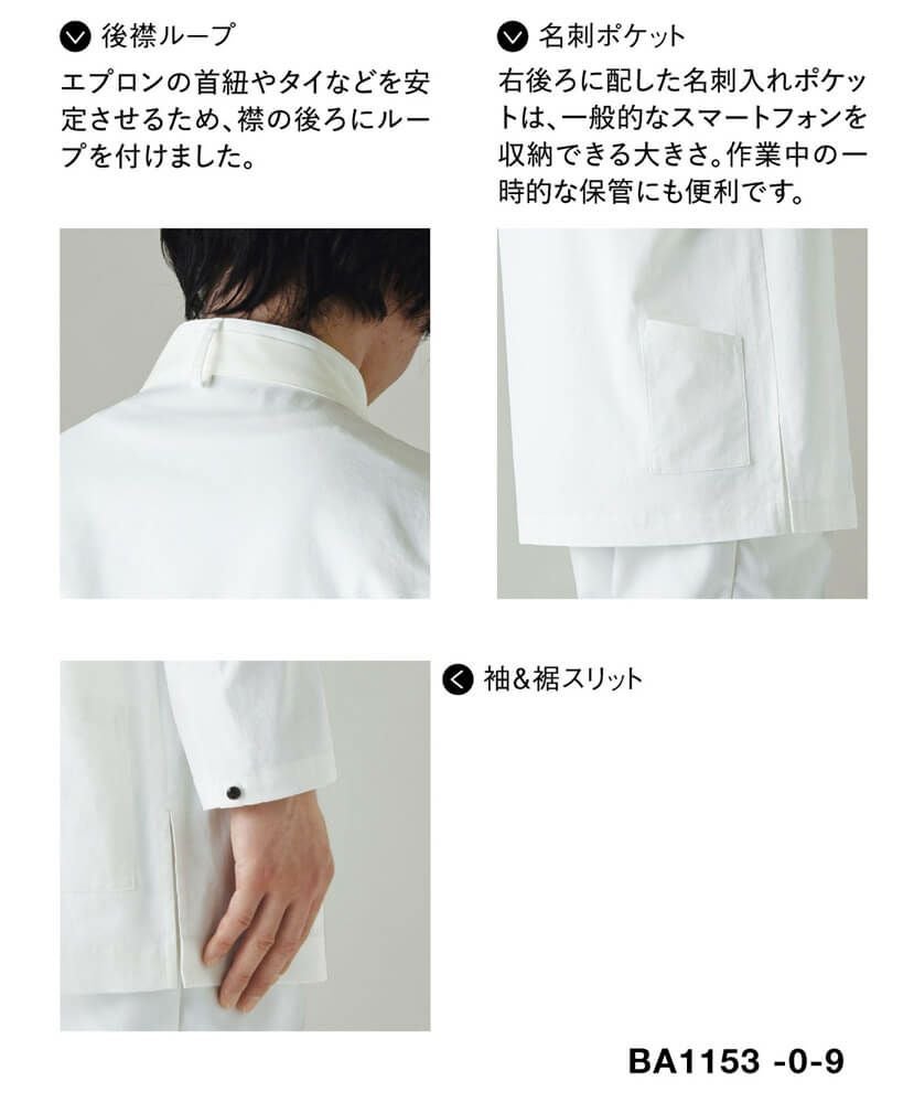 袖口を折り上げてカフスのようにしたり、エプロンやタイの紐を通すことが出来る後襟ループが付いています。左後ろに配した名刺入れポケットは、一般的なスマートフォンを収納できる大きさです。