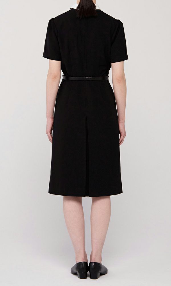 ポリエステル100%、高級ドレス向けユニフォーム生地のワンピース、ベルト付きのアイテムです。専用替衿は別途の購入が必要です。デザインはクラシカルなワンピースです。スカート部分のみ裏地あり、右脇のみポケットありです。 |