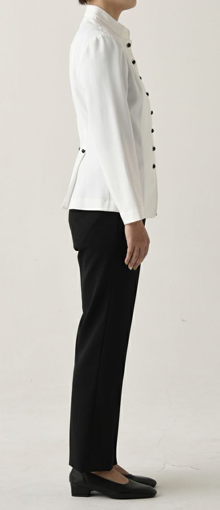 ポリエステル100%ですがウールのような風合いと柔らかさがあり、高級感と耐久性のある生地です。ストレッチがありますので動き易く、制電糸が織り込まれ埃などを寄せ付けにくく、白さを保つために洗濯時に汚れを落としやすい加工が施されています。裏地無し。前の黒い半球型ボタンと数が多いところが特徴です。後ろにフックベントとボタンが付いている軍服ディティールがよりクラシカルで素敵です。 |