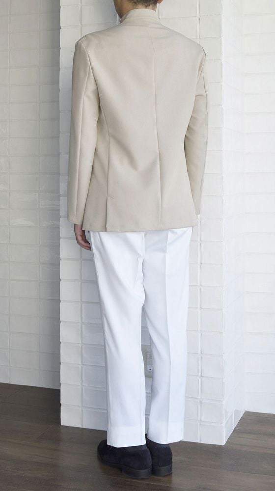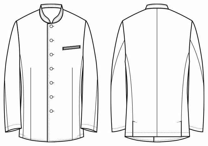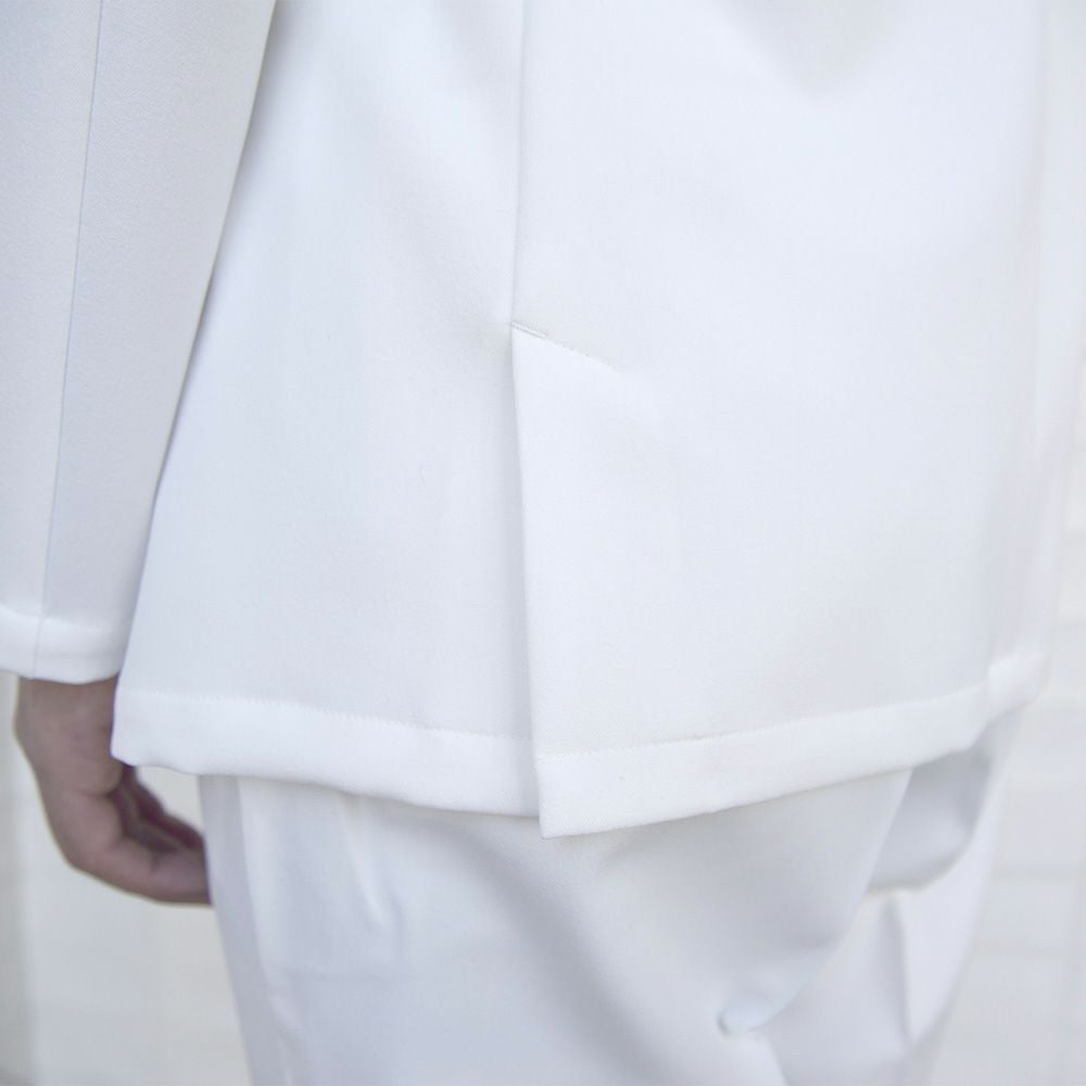 特徴 バンケット用として開発されたコートです。特徴は着丈が長いところ。どんな姿勢でも後ろ姿のホスピタリティーを保つ計算された長さです。ポケットは必要な胸部分のみ、ネーム用です。裏地はなく、洗濯性や耐久性高い生地で作られています。ストレッチがありますので動きに対してストレスはありません。制電糸も入っていますので埃などは寄せ付けず、白のみですが汚れを落とし易い加工が施されています。生地混率はポリエステル100%ですがウールスーツ生地のように見える高級感があります。後ろに浅めのベンツがあります。インナーはTシャツで良いですが、シャツを着てさらにエレガントに襟元を見せる着こなしもオススメです。