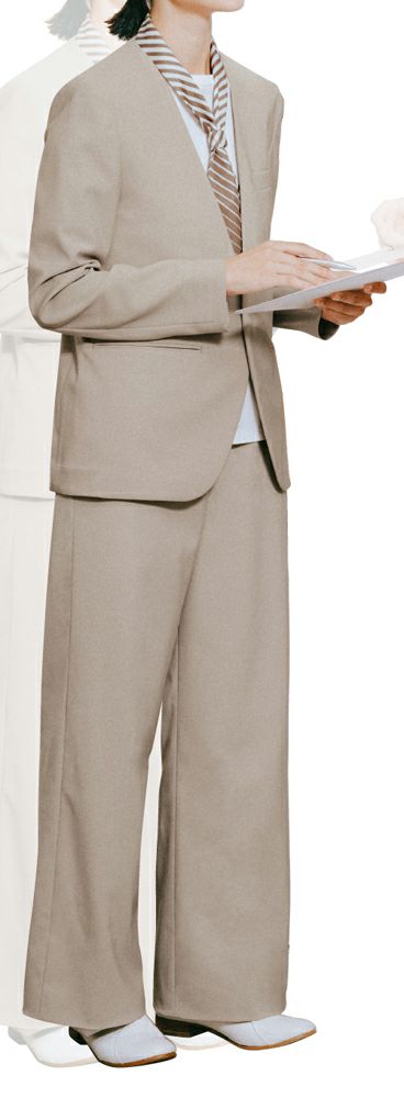 ノーカラージャケットとワイドパンツを合わせてゆったりおしゃれなムード。きちんと感も体型カバーも◎。