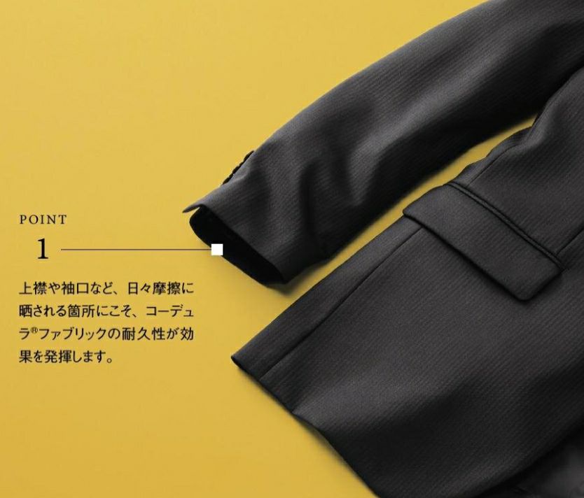 通常のナイロンと比べて非常に優れた強度と耐久性を持つコーデュラ(R)は、摩耗、引き裂き、擦り切れへの強さが特長です。仕事で忙しい毎日、着ている服の前端やポケット端、袖口などが毛羽立ったり、擦り切れたりという経験がある方も多いはず。そんな不快な思いもこのコーデュラ(R)ファブリックなら解決してくれます。一着のスーツを綺麗に着続けられること。それがコーデュラ(R)ならではの特長です。
