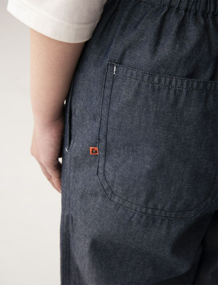 一般的にワイドパンツはそのリラックスさから人気がありますが、火や刃物を扱う厨房では動いた拍子に何かに引っかかってしまう危険性のあるワイドパンツはあまり好まれません。 こちらのパンツはタブで裾を絞ることで足元がスッキリし、リラックスさはそのままアクティブに活動することが可能になりました。 全ポケット口に補強用の“カンヌキ“が白糸で施されています。