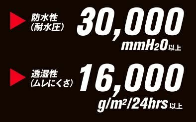 耐水圧30,000mmH₂O・透湿度16,000g/m² /24hrs